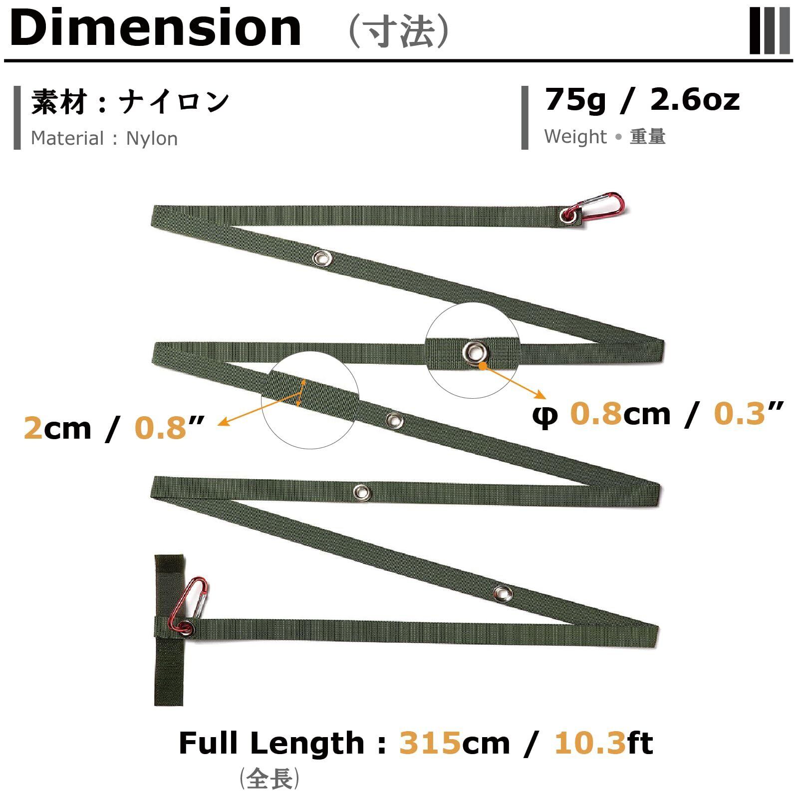【サイズ】- 小川張りベルト幅2cm、全長315cm、固定孔径8mm、重量75g、カラビナつき、使用便利です