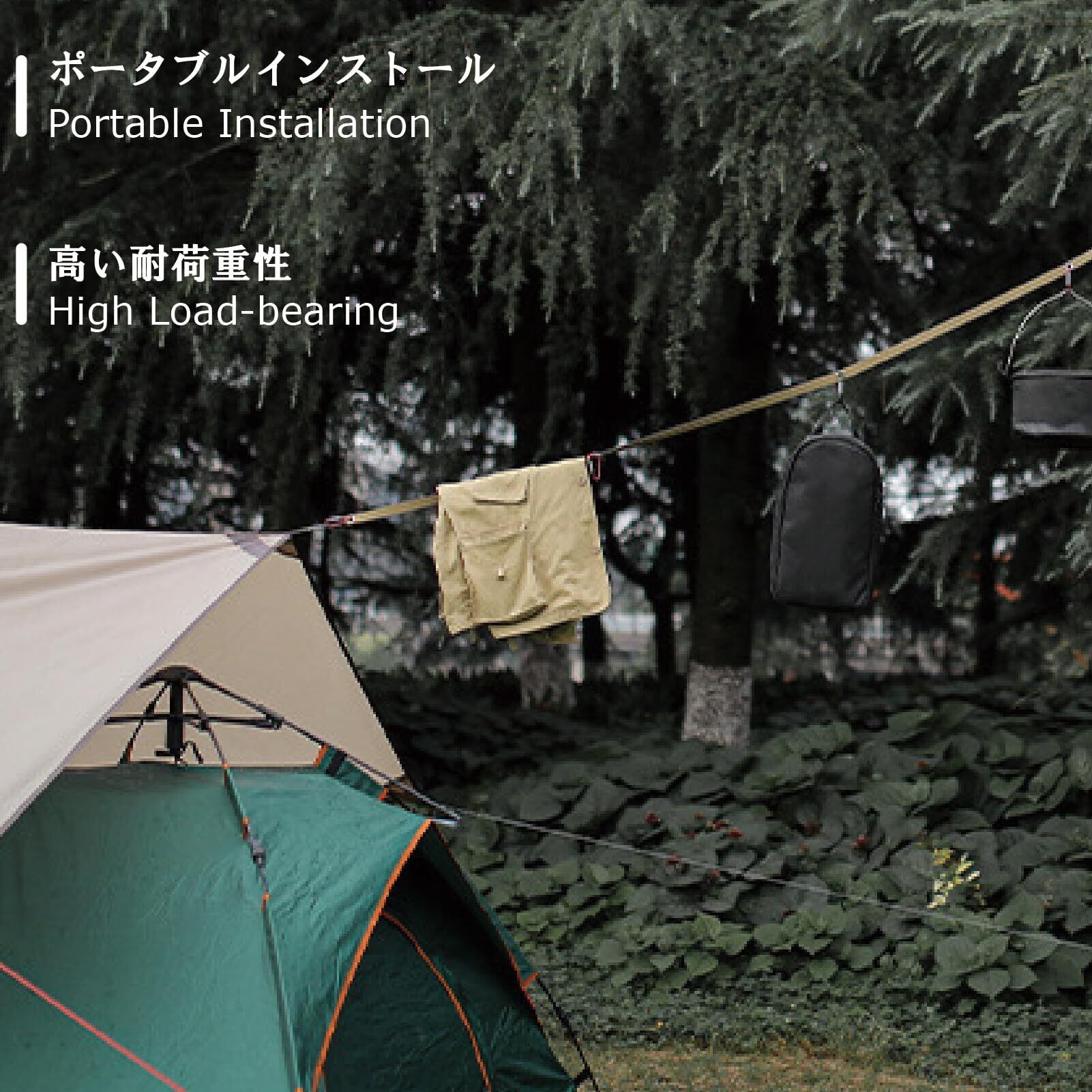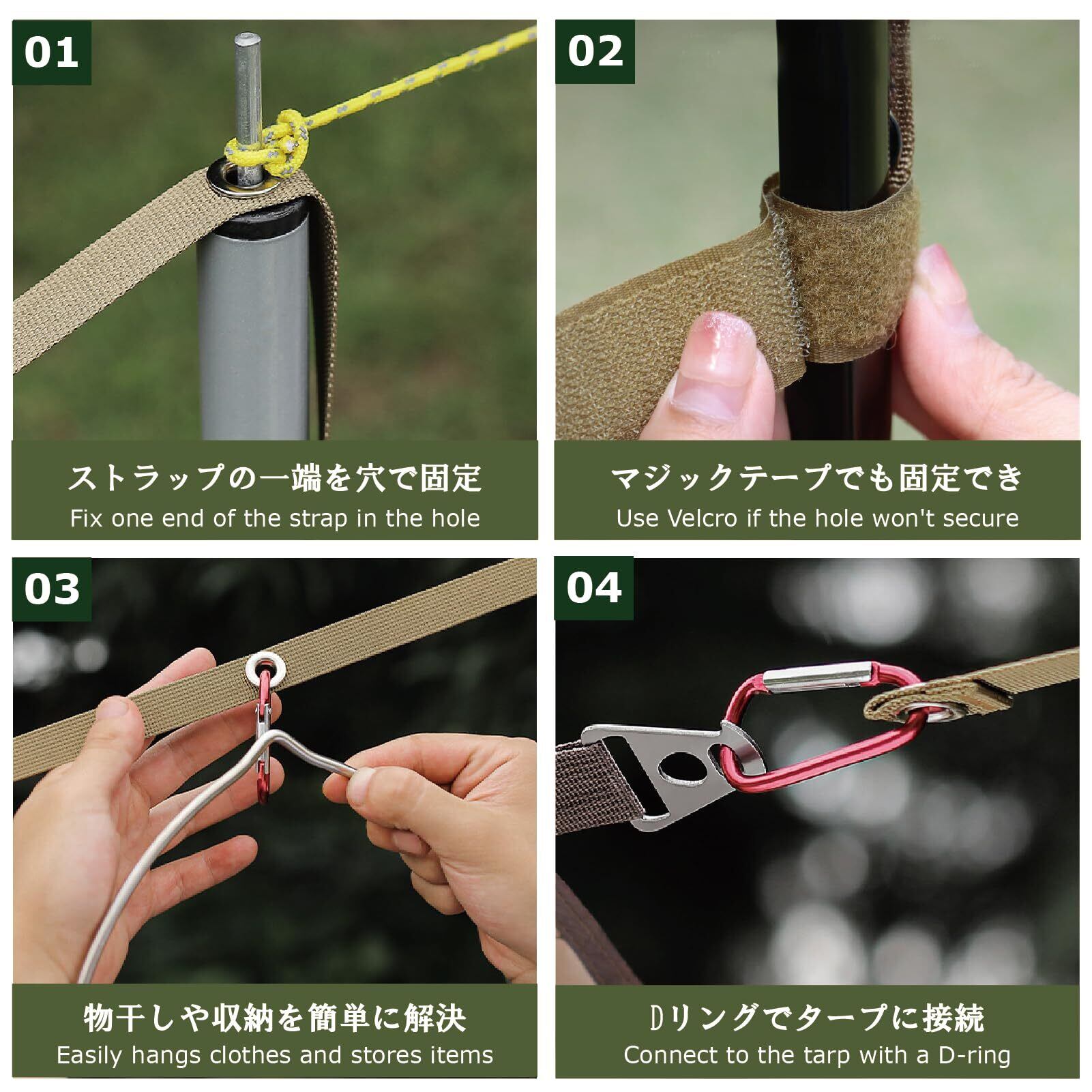 【大活躍】- 末端は面ファスナーで取付/取り外し、設営中の脱落を回避できます。テント、タープの設営、キャンプ、BBQ、服干し、ツール吊りなど時にご活用いただけます