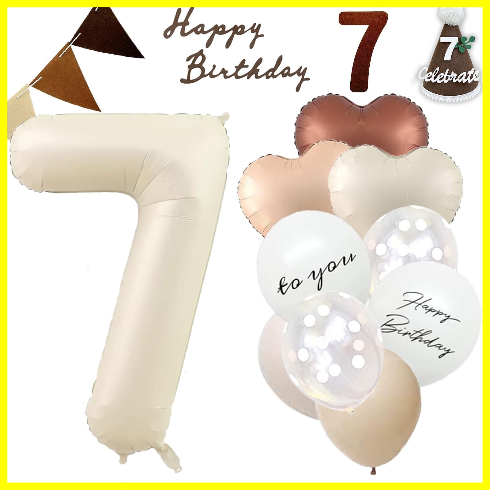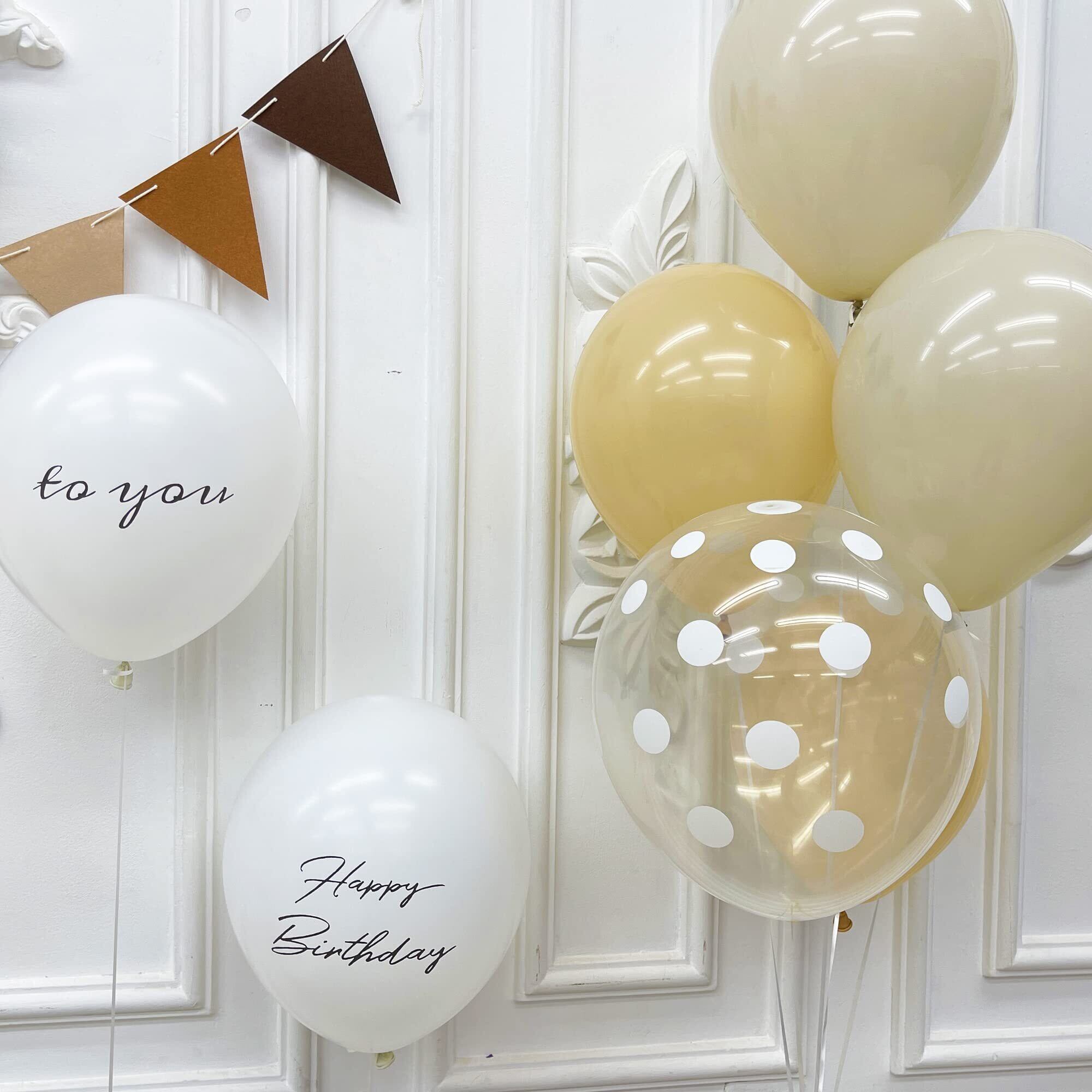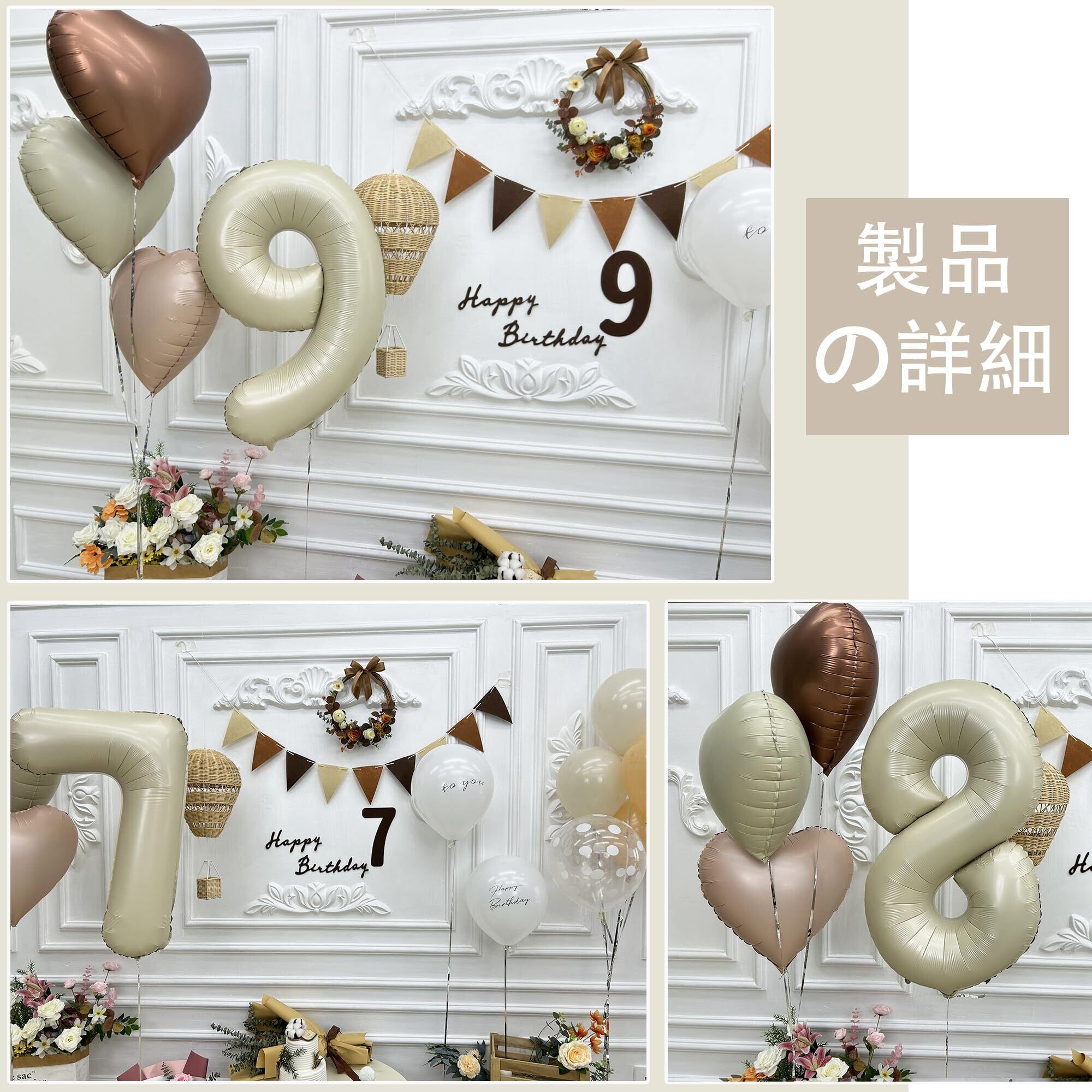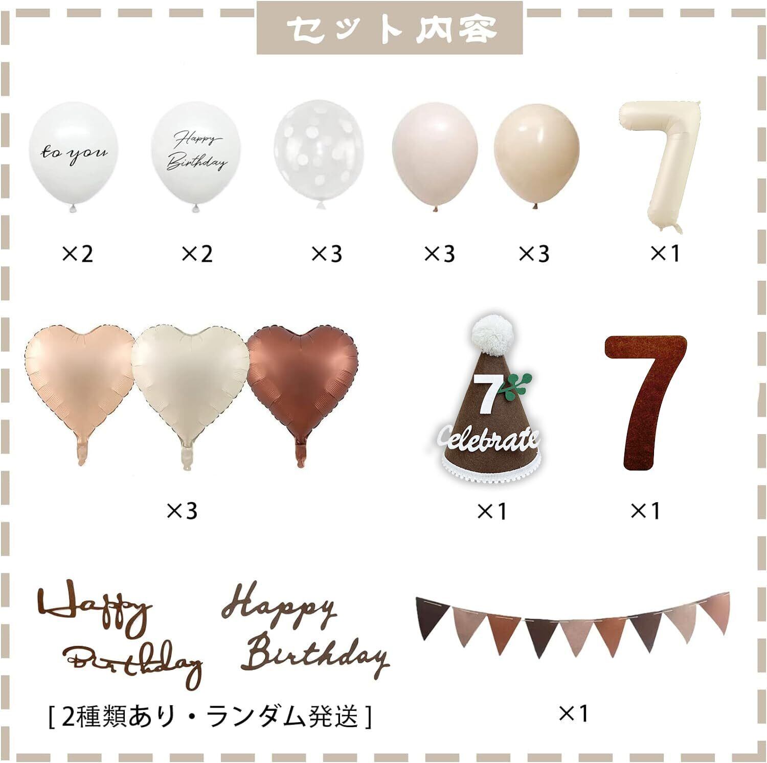 【セット内容】①ゴム風船×13(Happy Birthday × 2、TO YOU × 2、グレージュ× 3、肌色× 3、クリアドット× 3) ②ハートバルーン×3(クリーム色×1、肌色×1、チョコレート色×1) ③数字バルーン×1 ④三角帽子×1 ⑤フェルトの三角旗ガーランド×1 ⑥フェルト数字 ⑦フェルトアルファベット(2種類あり・ランダム発送) ⑧両面テープ