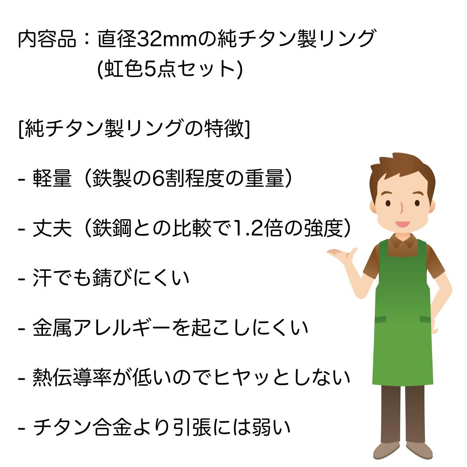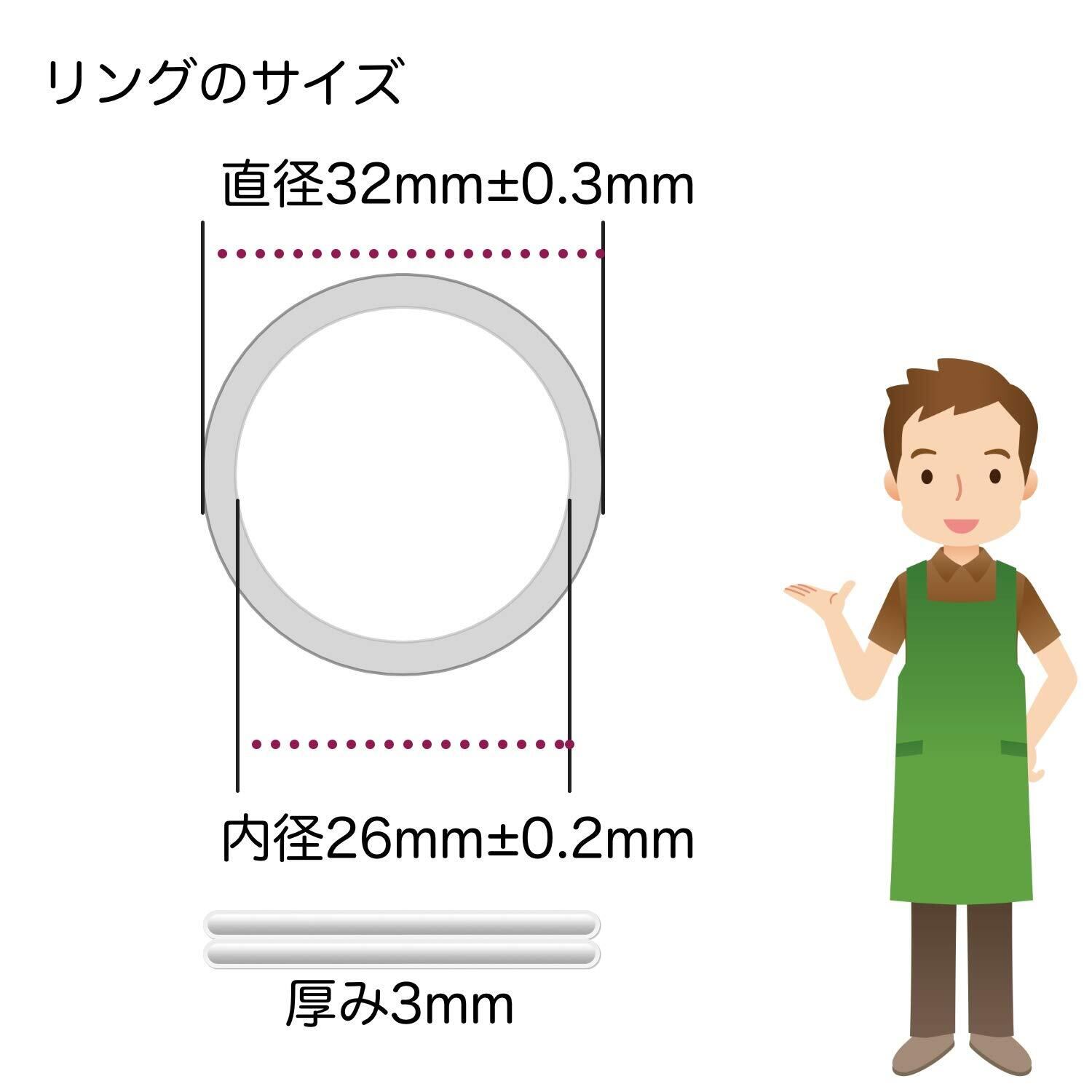 材質:純チタン製 外径:32mm±0.3mm 内径:26mm±0.2mm チタンの弾力特性上、6mm以上隙間を広げると隙間が開いて戻らなくなる可能性があります。