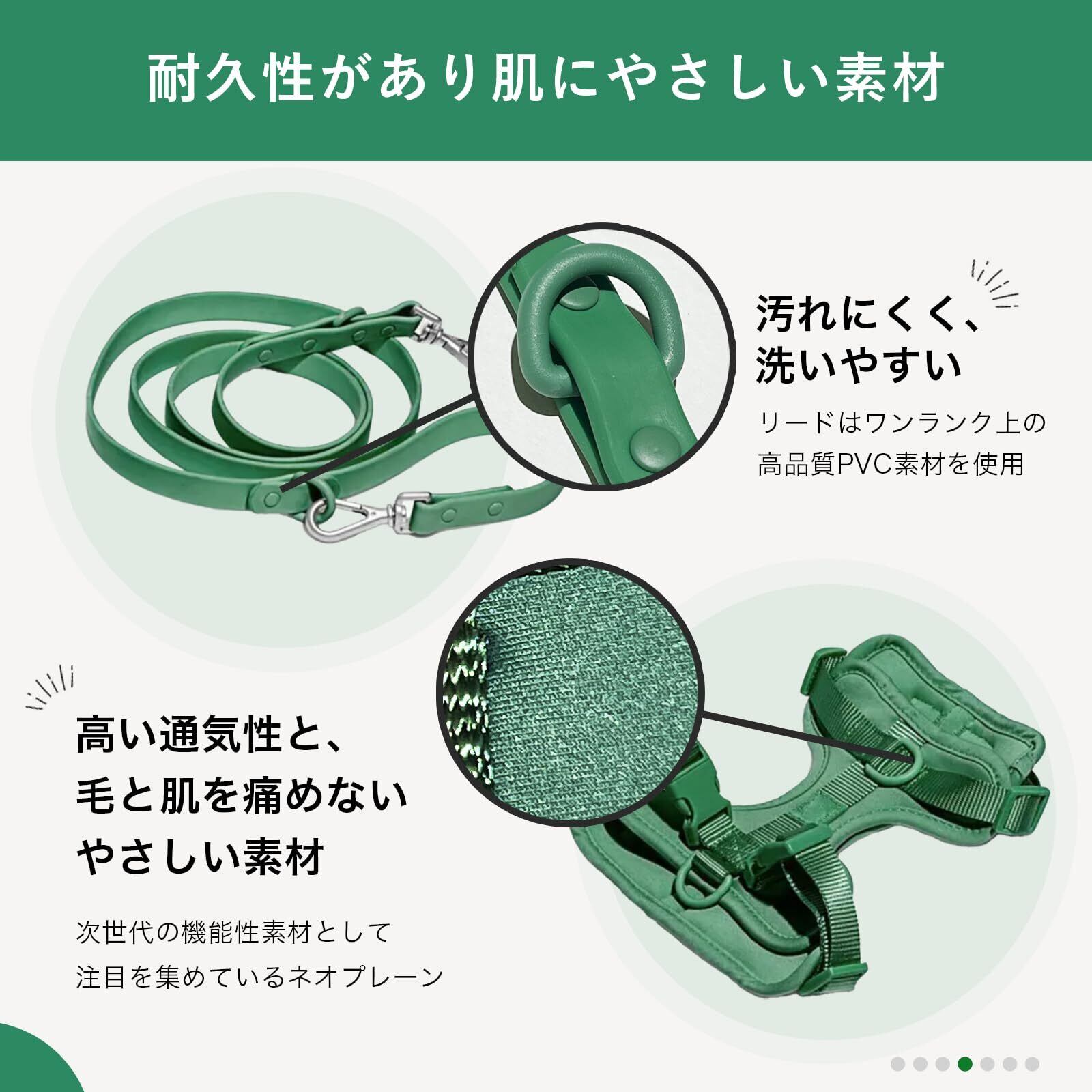 素材: ハーネスは通気性のあるデュポン社のネオプレン素材、リードはワンランク上の高品質PVCを使用。