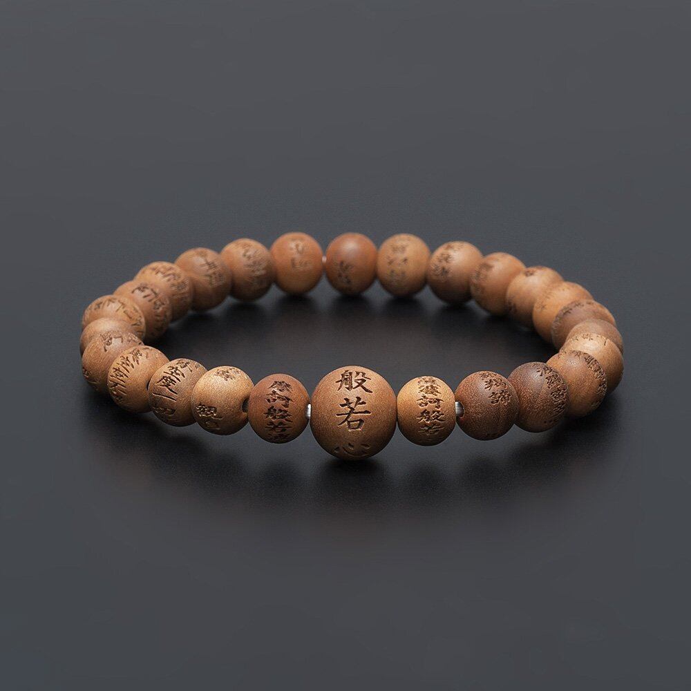 般若心経は仏教の教えを集約した経典で、読むことによって膨大な経典の大般若経600巻全てを読んだに等しい功徳が得られ、一切の苦厄が取り除かれるといわれています。上質なインド白檀に、般若心経を細かく丁寧に彫り込んだ、ご利益のある念珠ブレスです。