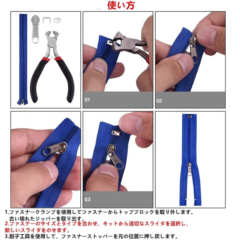 3.ジッパー取り付けるペンチ付き:ジッパー取り付けるペンチが付いています。10.5x7 cmのコンパクトなサイズで 、ファスナーストッパーを取り付けること、またはジッパーのとい付けることなどにも使いやすいです。他の工具不要で、1セットがあれば、自宅のすべてのジッパー問題にも自分だけで気軽に対応できるでしょうね。