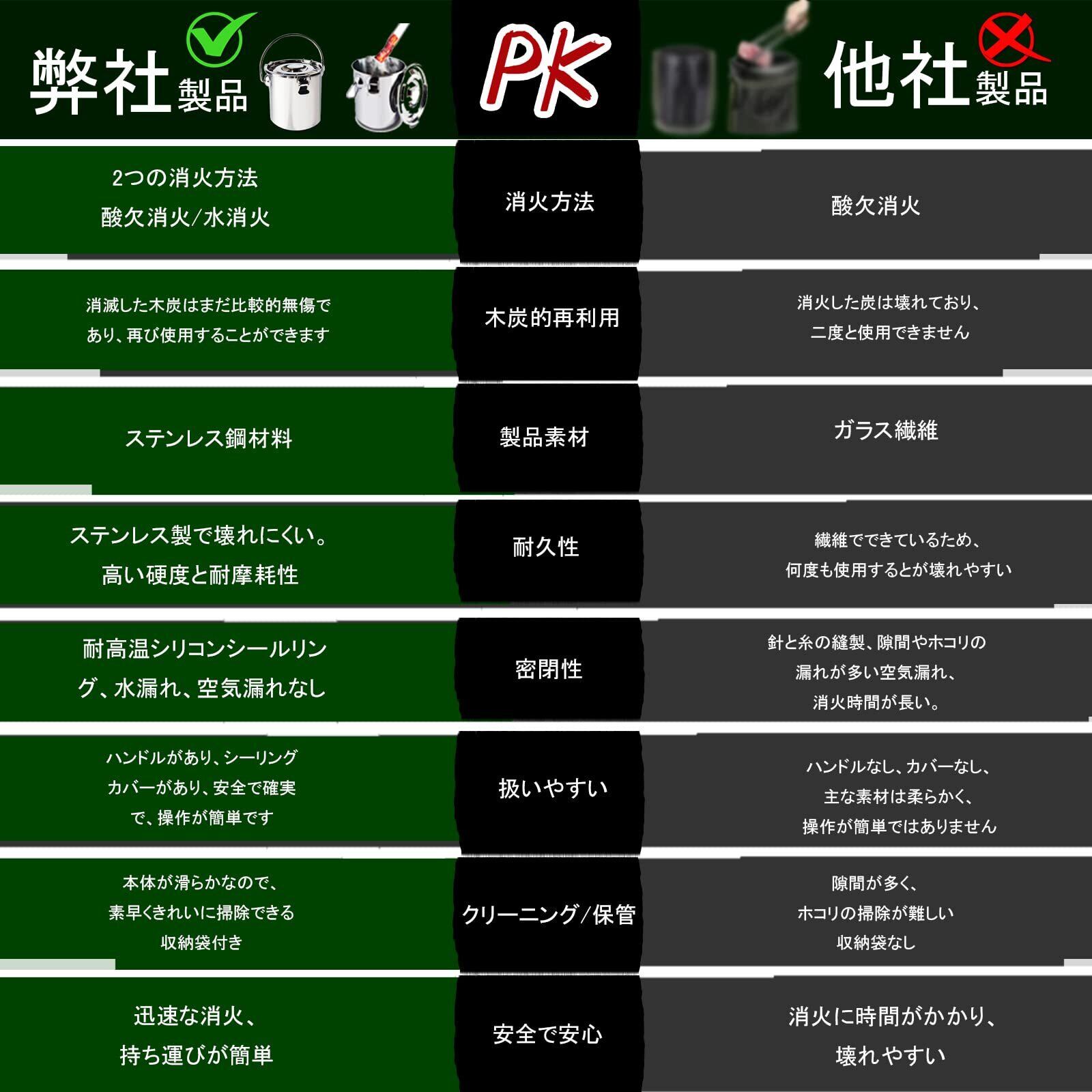 ②機能メリット:3つのロックが蓋を閉めることができ、蓋を閉める時にステンレスチャコール樽の密封性が未燃焼済の炭を酸素遮断し、無酸素状態に達すると消灯します。 冷水を入れると炭を素早く冷温すると消灯状態にできます。 またバケツ内は燃えないチャコールは、キャンプや焚き火泊り、炭が必要な場合でも再利用でき、無駄を拒否します。 ステンレススチール製のチャコールバケツは水に濡れても錆びにくく、何度でも使えるので経済的です。