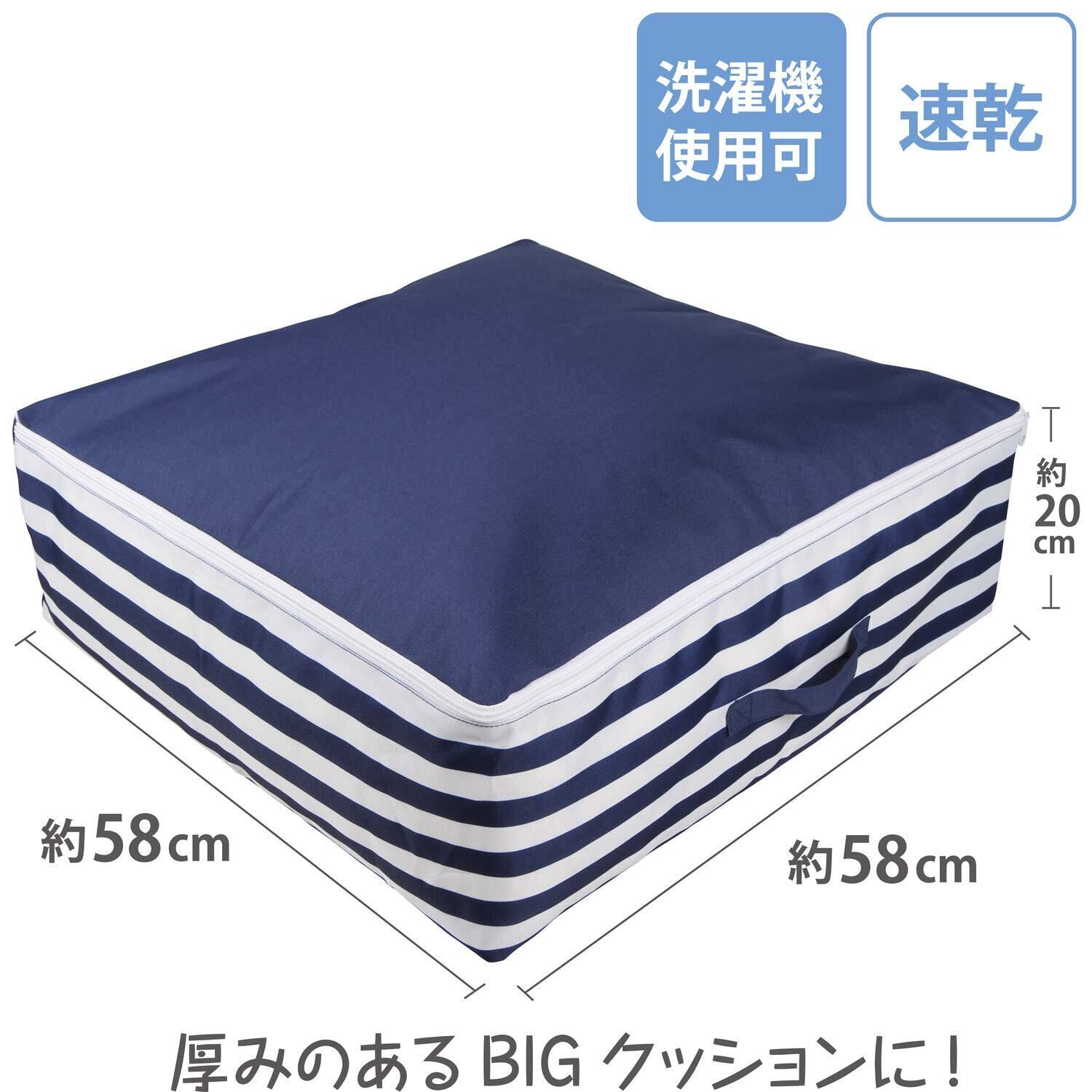【商品仕様】:サイズ/約幅58×奥行58×高さ20cm、カラー/ネイビー、柄/ボーダー、内容/1個、収納目安/シングルサイズの羽毛布団:約1枚・毛布やタオルケット:約1~2枚、材質/ポリエステル