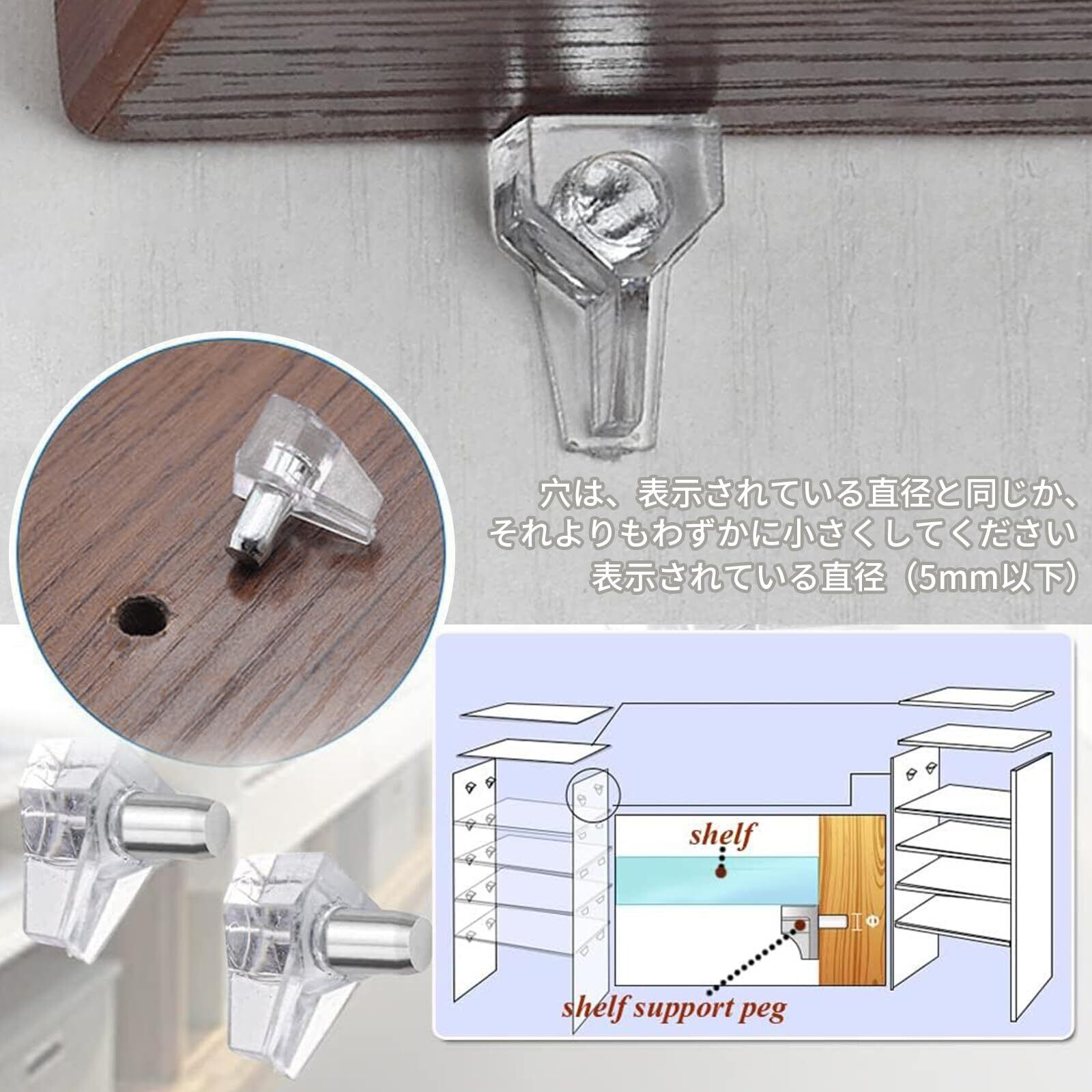 【広く使用されている】棚サポートペグは、キャビネット、ワードローブ、ベッドサイドテーブル、本棚などの5mmの棚穴に挿入することができます。
