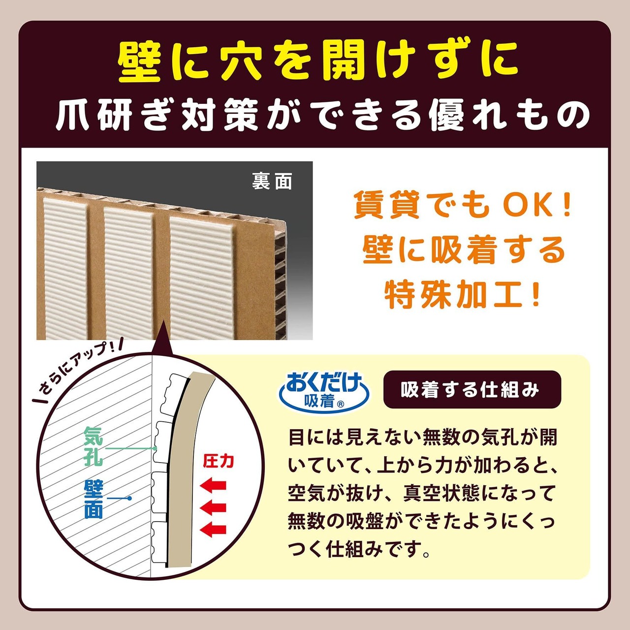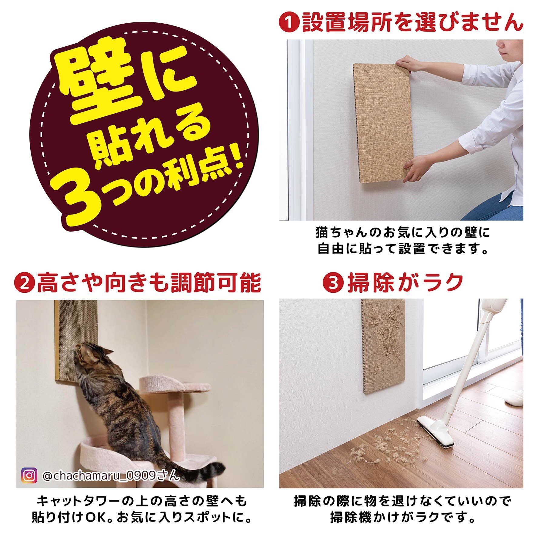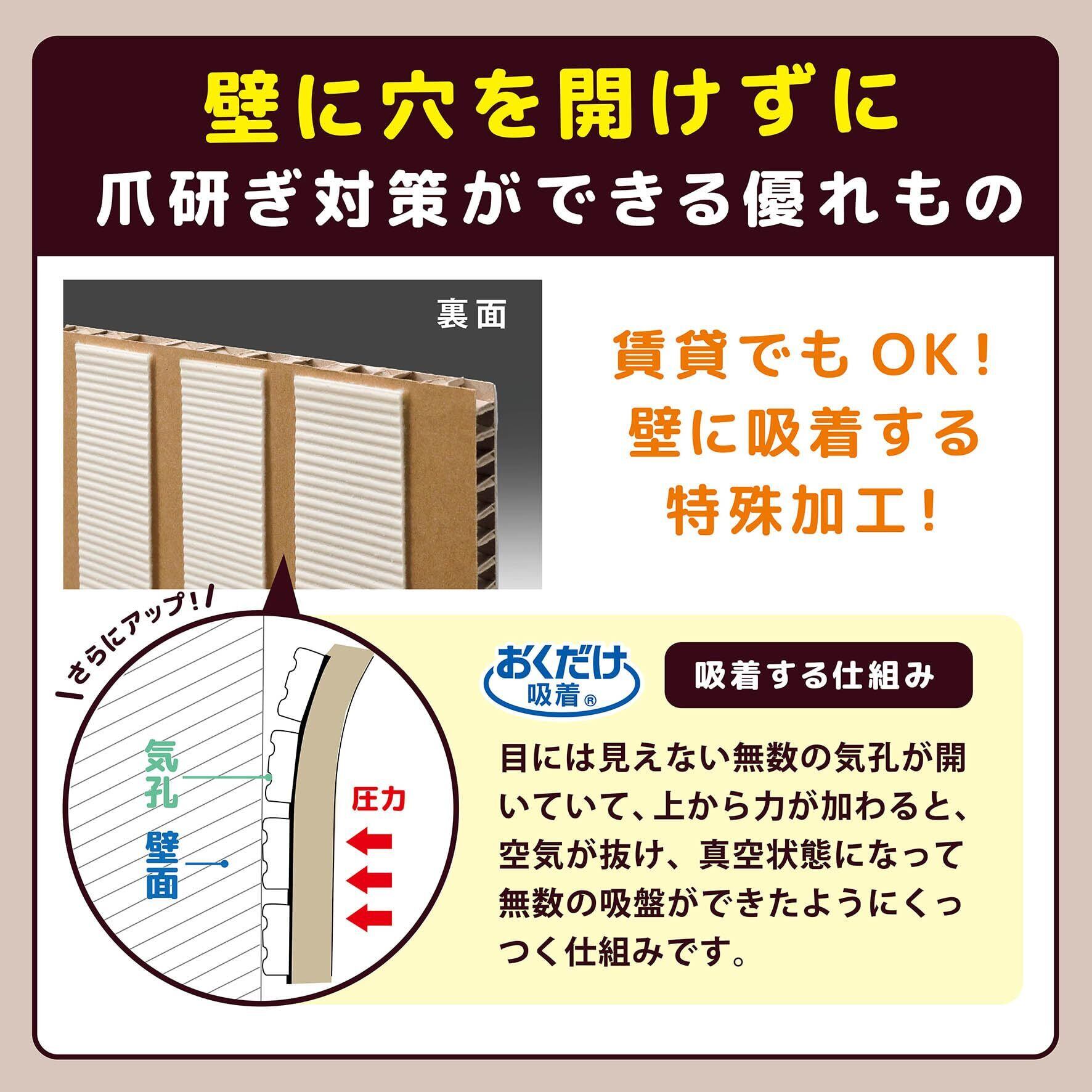 ・壁に貼ることができる猫専用の爪とぎです。 ・貼る高さを猫の大きさに合わすことができます。 ・貼ってはがせる吸着タイプです。ノリ残りがなく、繰り返し貼って使用できます。 ・ヨコ向きでも貼れます。