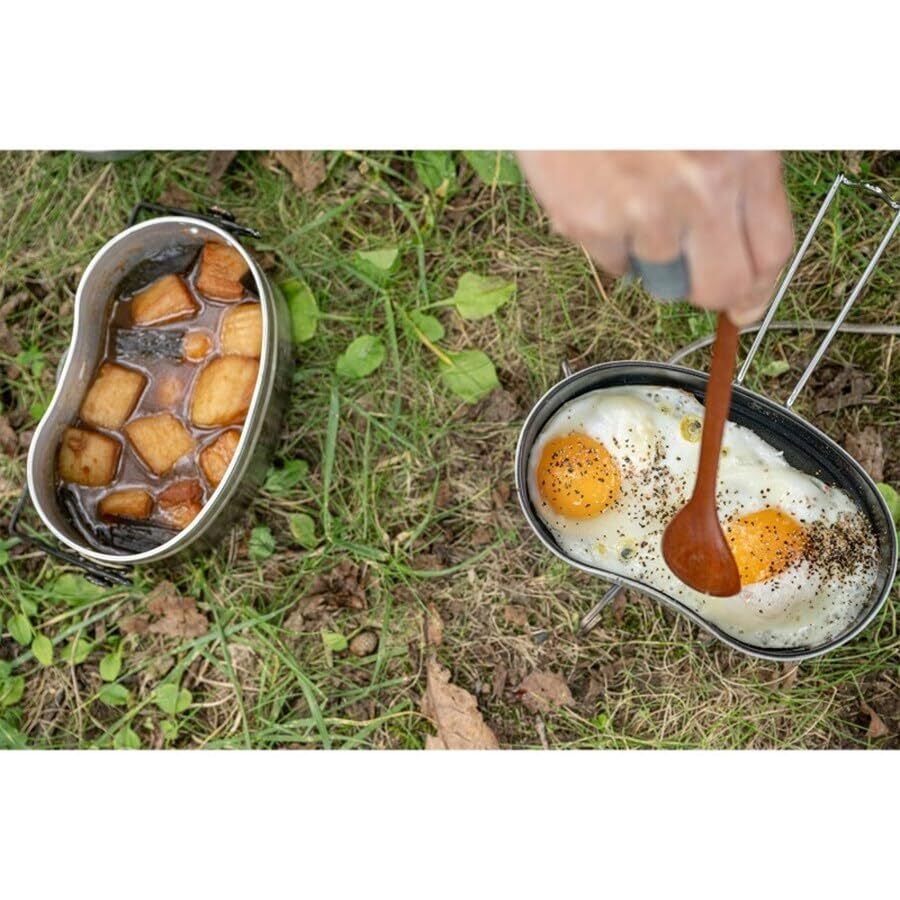 飯盒にフィットする焦げ付きづらいフライパンとして、携行しやすい変形フライパンとして新たな提案です。