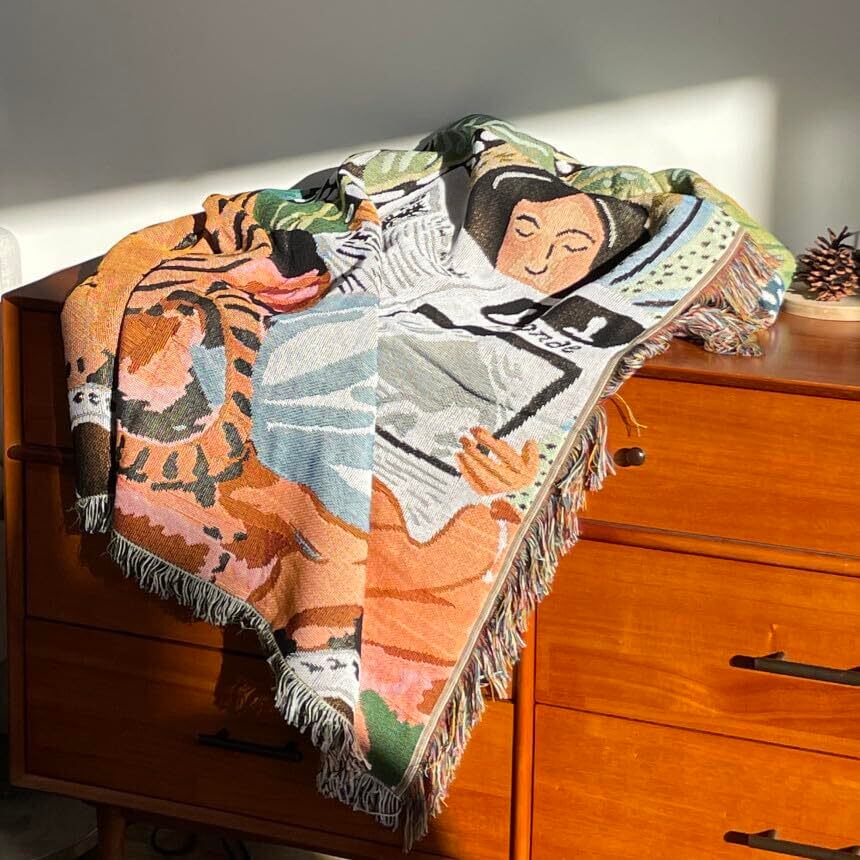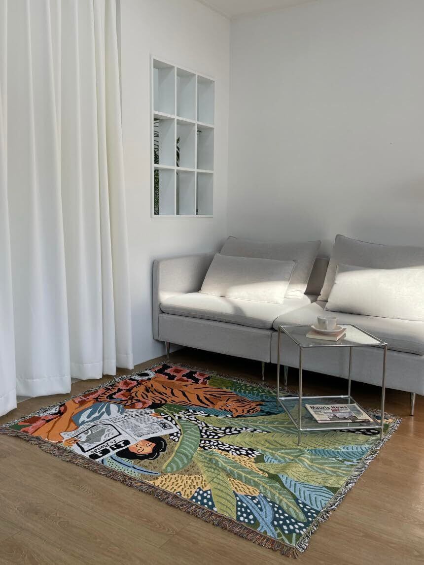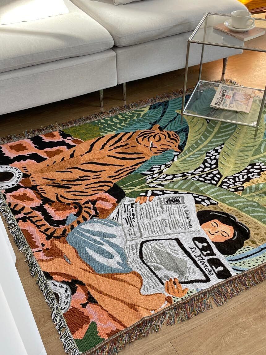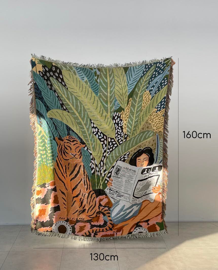 Peel Forest トロピカル南国風植物 ,アメリカン雑貨 タイガー マルチカバー ラグ おしゃれ かわいいトラと女の子 ブランケット 130X160cm………