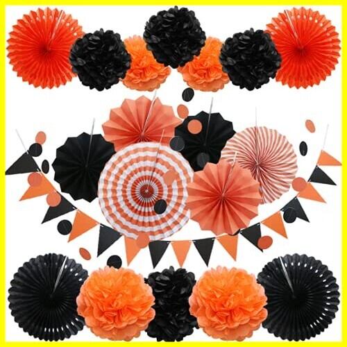 【ハロウィン ペーパーファンセット】①1 x 3mの三角形ペナント ②8 x 25cm ペーパーポンポン(黒*4+オレンジ*4) ③6 xペーパーファン(20cmx2+30cmX2+40cmx2) ④4 x25cm透かし彫りペーパーファン ⑤2x 2mサークルペーパーガーランド。ハロウィン飾り付けセットです。これだけでおしゃれな空間にコーディネートできます。ハロウィン気分をグッと盛り上げます。ハロウィンには欠かせないハロウィンペーパーファン大集合!
