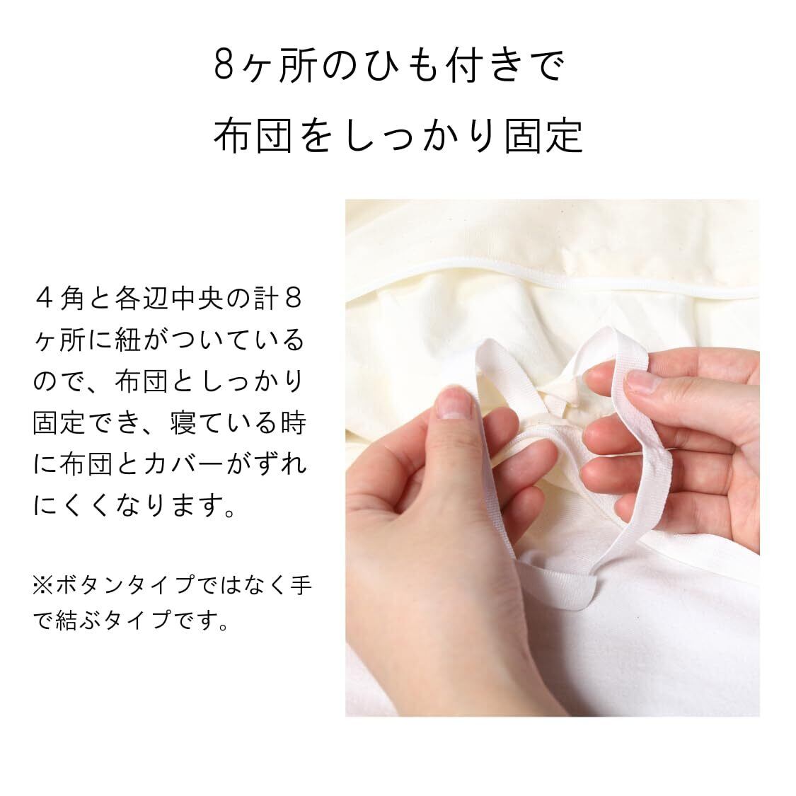 <その他仕様> 長辺片側ファスナー開閉、布団固定ひも8ヶ所付き。ファスナーは長辺の端付近まで開きますので、ふとんの出し入れ着脱が比較的容易にできます。布団についているループ(紐とおし)と固定紐を結ぶことでカバーをずれにくくすることができます。薄手軽量なのでお洗濯のしやすいです。