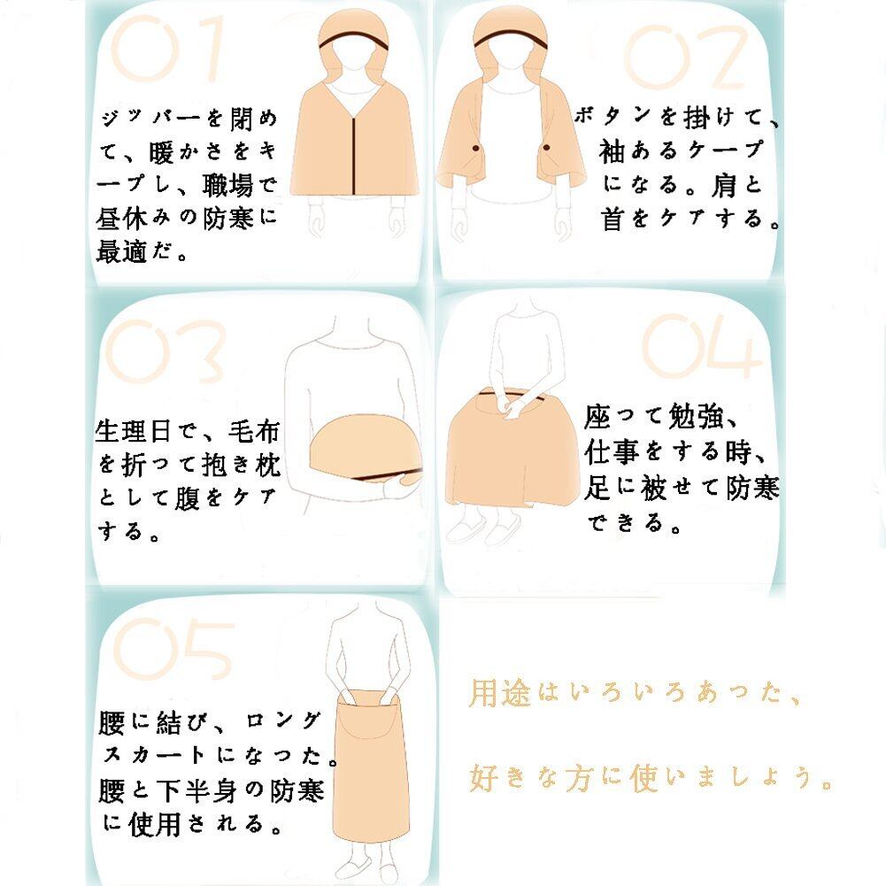 昼休み用、エアコンの部屋の防寒、ルームウェア、夜の仕事用などに大活躍です。肩、腹、膝、足などのケア、自由に使用できます。実用性は高いです。