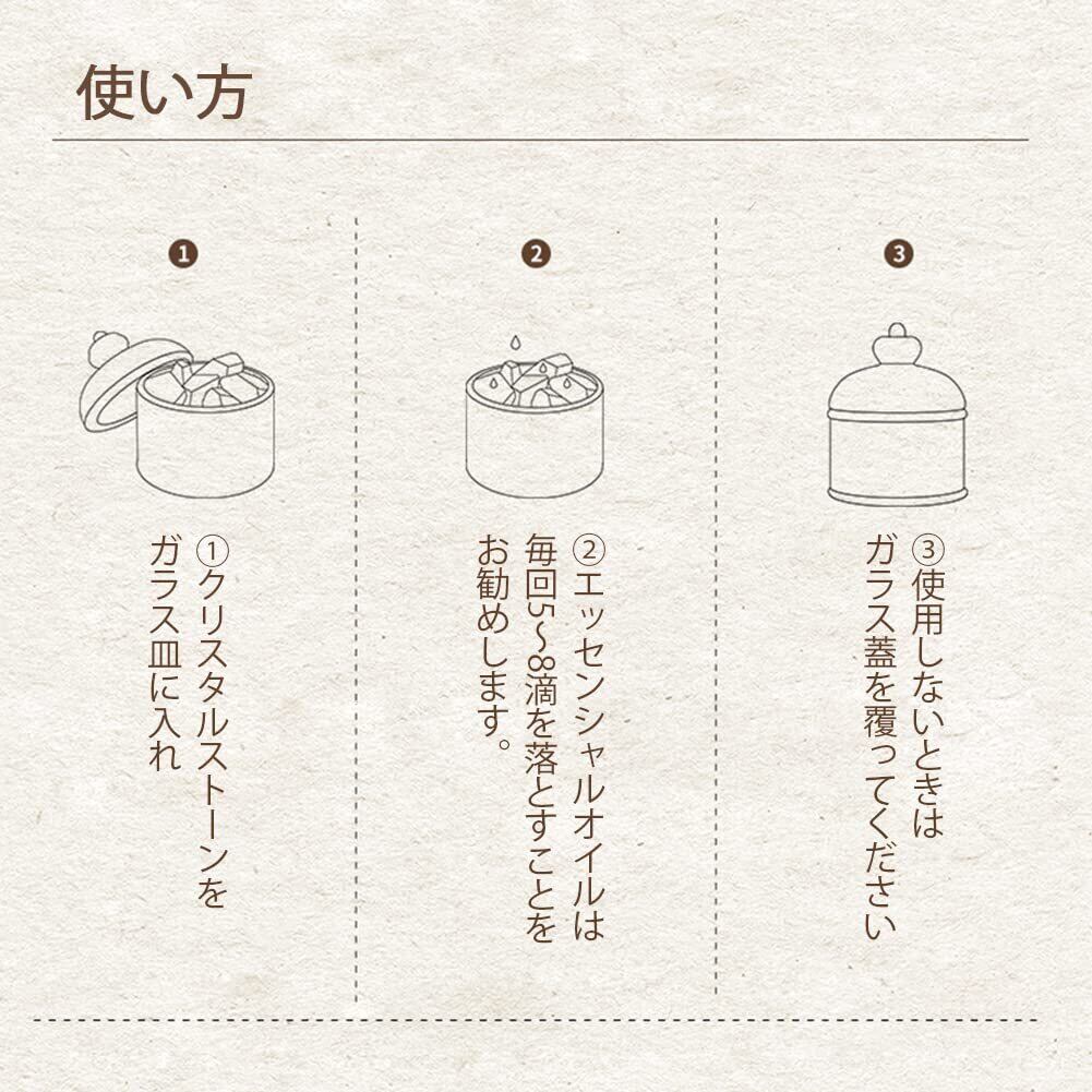 ◆使い方:①クリスタルストーンをガラス皿に入れ、エッセンシャルオイルは毎回5〜8滴を落とすことをお勧めします。②ガラス容器をランプ台座に置き、③スイッチボタンをオンにする。④香りの早すぎる揮発を防ぐために、使用しないときはガラス蓋を覆ってください。⑤香りが散らしてから、またエッセンシャルオイルをたらしてください。