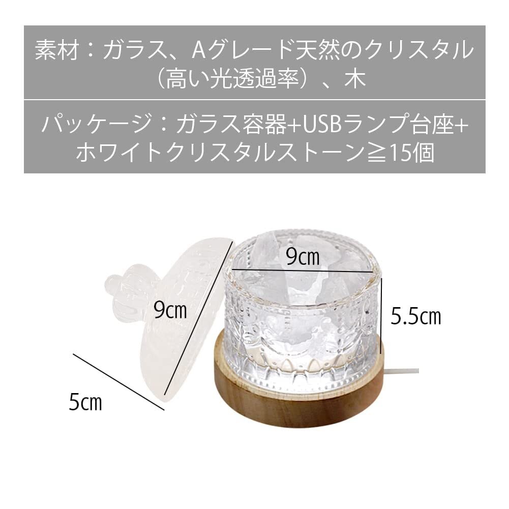 ◆仕様:アロマ用天然クリスタルストーンランプ、◆素材:ガラス、Aグレード天然のクリスタル(高い光透過率)、木。ランプ台座は厚くてより安定し、ガラス容器は絶妙なパターン付き、USBプラグなし、エッセンシャルオイル無し。ランプ台座はスイッチボタンとUSBケーブル付き、3色のライトが切替え、明るさ調整できます。◆サイズ・重量:ガラス容器:直径*高約8.5*11cm。ガラス皿5.5*9cmガラス蓋5*9cm。クリスタルストーン:300g。◆スタイル:ホワイト。◆パッケージ:ホワイトクリスタルストーン≧15個+ガラス容器+USBランプ台座。