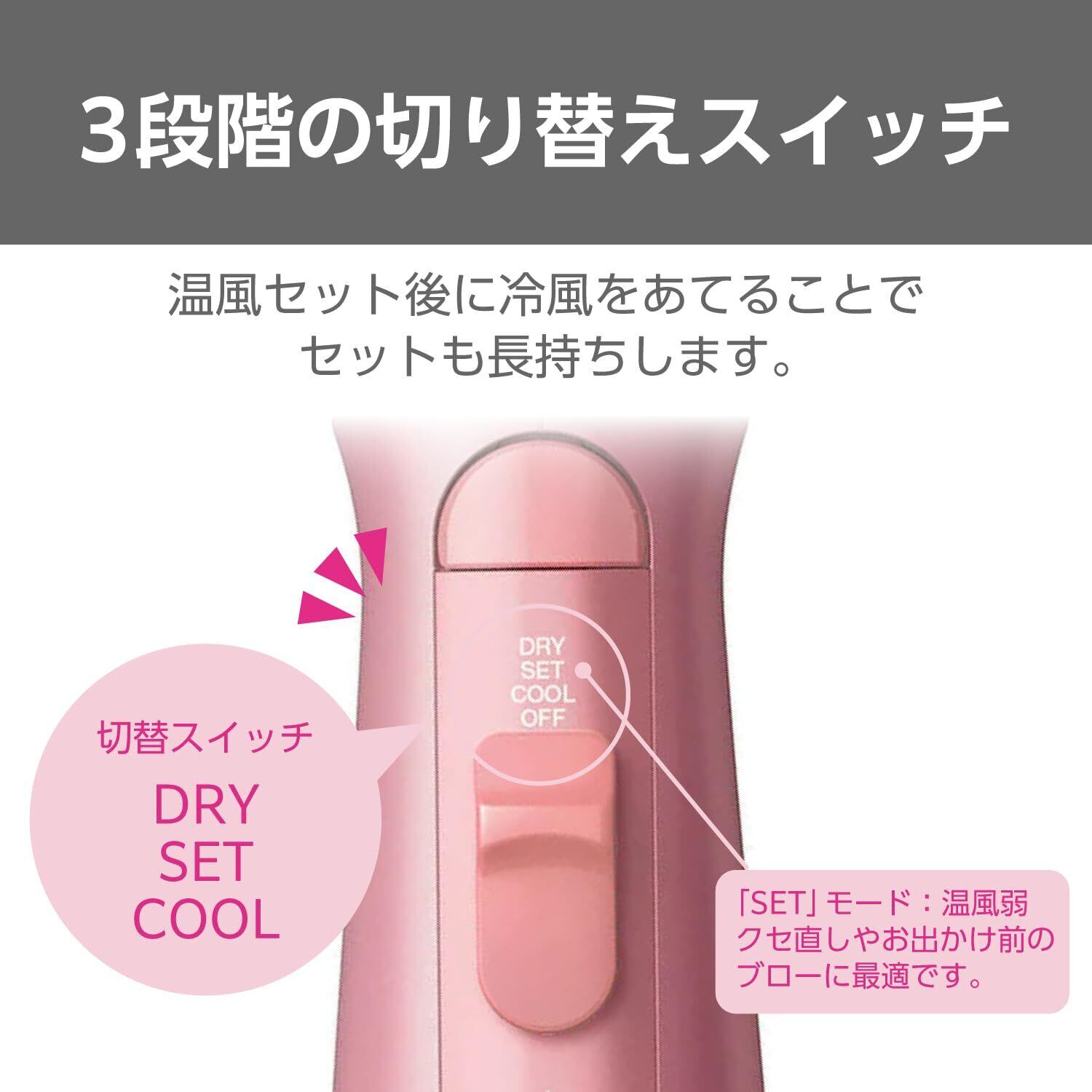 ■クセ直しやお出かけ前のブローに最適な「SET」モード(温風弱)を追加しました。 温風セット後に冷風をあてることでセットも長持ちします。