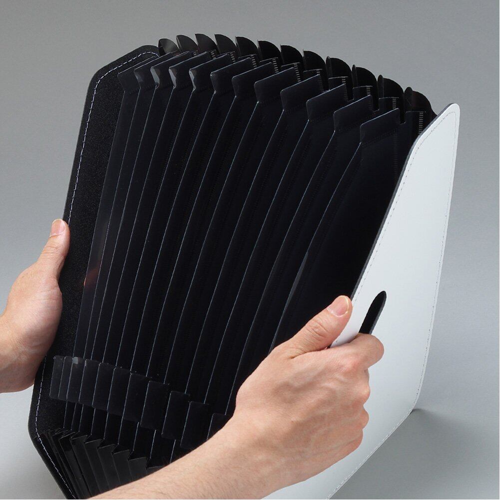 書類のボリュームによってポケットが伸び縮みする分類に便利なアコーディオン式。