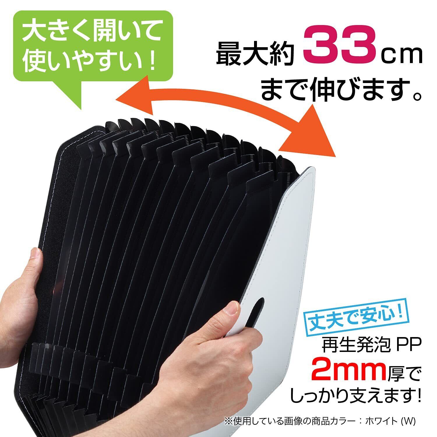 ●収納量に応じて伸縮自在●デスク上に置いて書類を立てて収納できる、アコーディオン式の収納スタンド。最大約33cm。●伸ばすと自立、縮めるとコンパクト。●検索に便利なインデックス付。(※切り取って差し込みます)12仕切り13ポケット。●収納物の量に応じてポケットが伸縮自在。●厚くて丈夫な3層構造の発泡PP素材を使用。●高級感のあるステッチ加工。