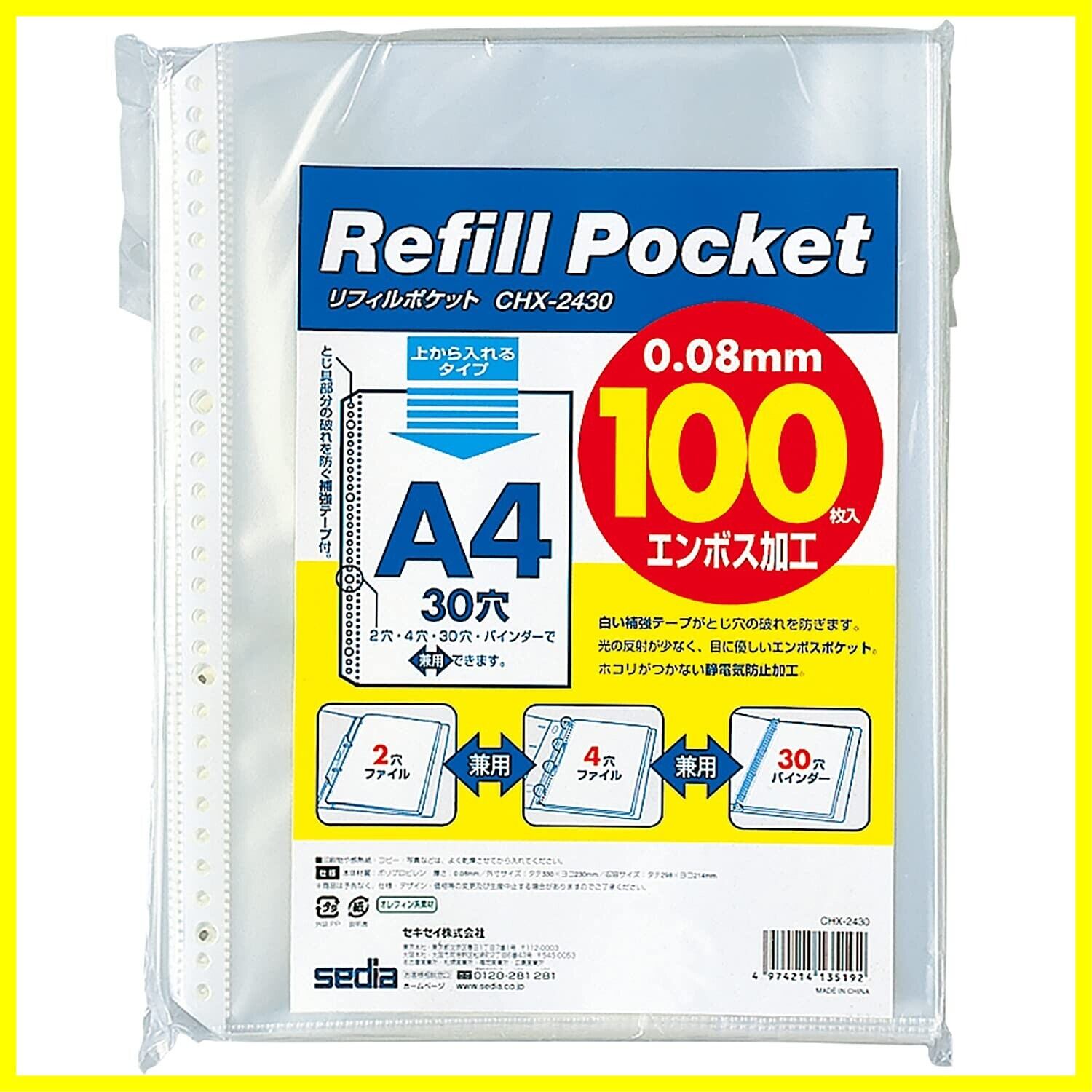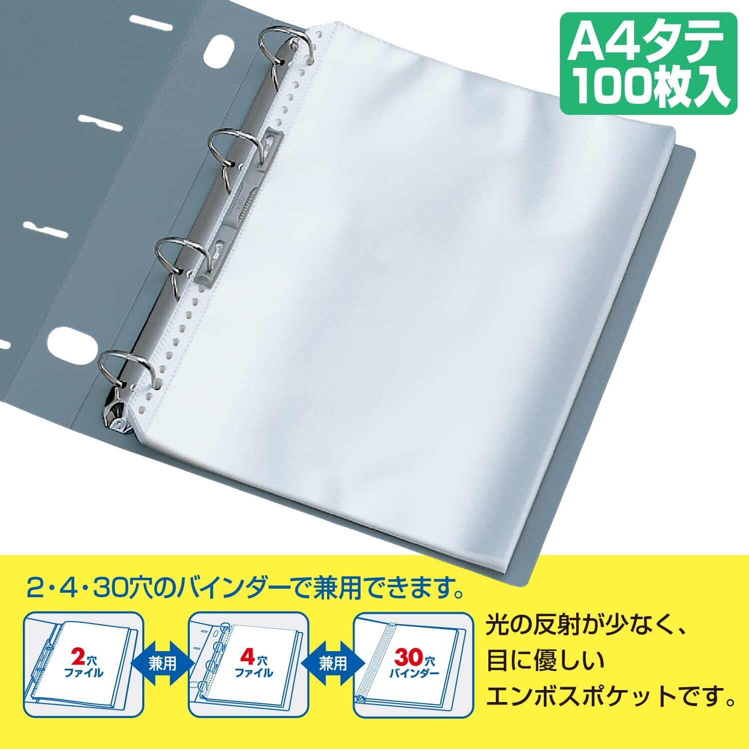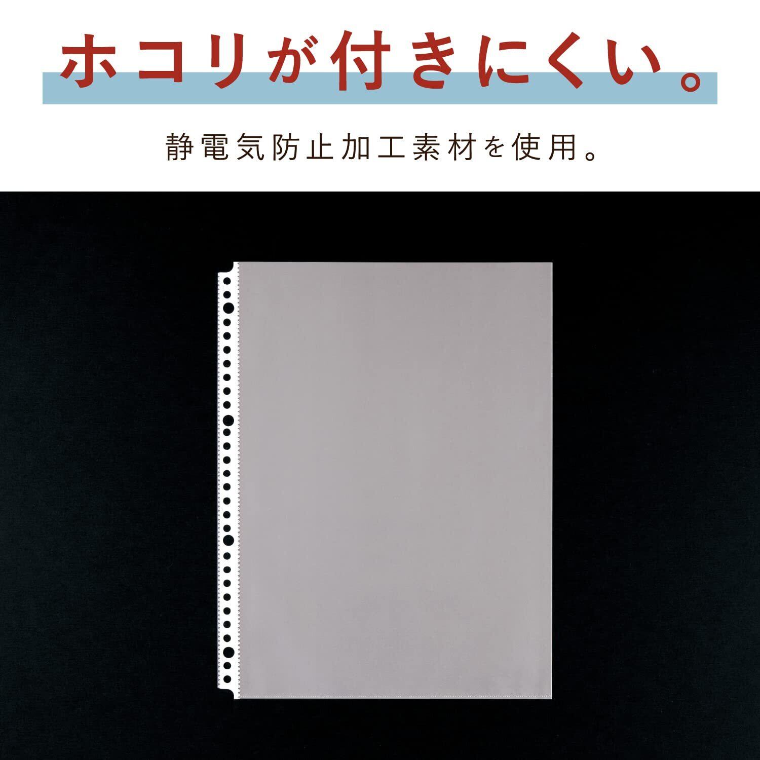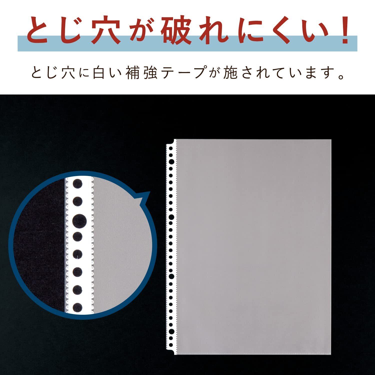 たっぷり使えて経済的なリフィルポケット。 白い補強テープが、とじ穴の破れを防ぎます。 光の反射が少なく、目にやさしいエンボスポケットです。 ホコリが付きにくい、静電気防止加工素材を使用しています。 2・4・30穴のバインダーで兼用できます。