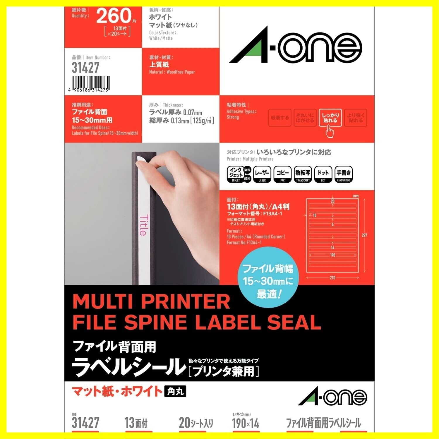 エーワン ラベルシール ファイル背面用ラベル 13面 20シート 31427
