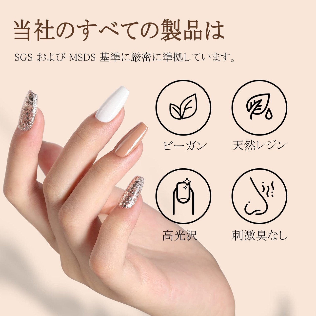【製品特徴】ネイルとカラージェルの密着性を高め、ネイルの表面を保護し、ジェルが剥がれにくく、ネイルのツヤを長時間保します。自爪や肌に優しい天然レジンを使用し、無毒でより安心です。
