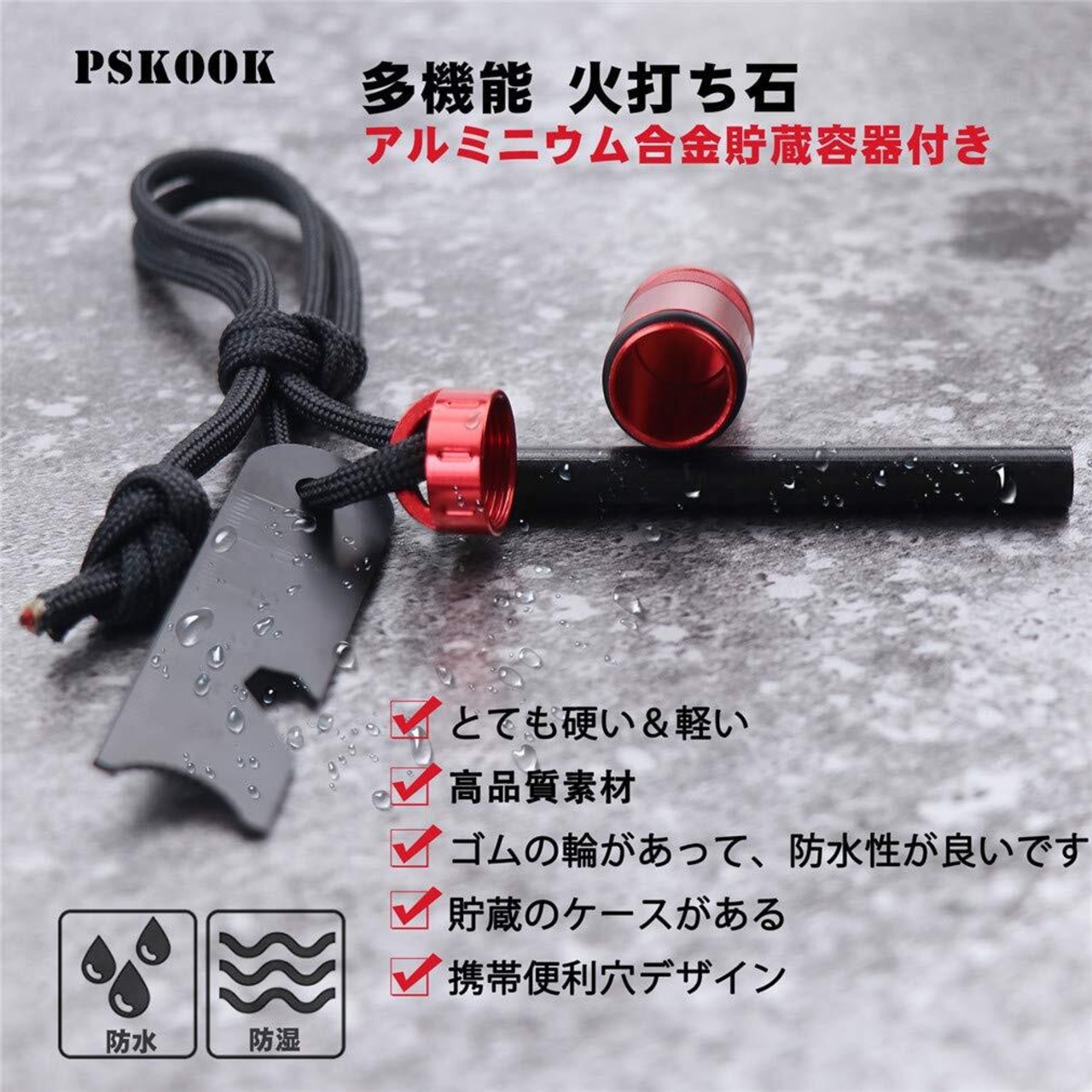 【全天候型対応ファイヤースターター】水・雨につよい:ロッド部は水に濡れても、拭けばすぐに使用可能!災害時や悪天候下でも安心です!高所でも着火可能:酸素が薄い高所でも、マグネシウムは酸素と結合しやすいので安心です!