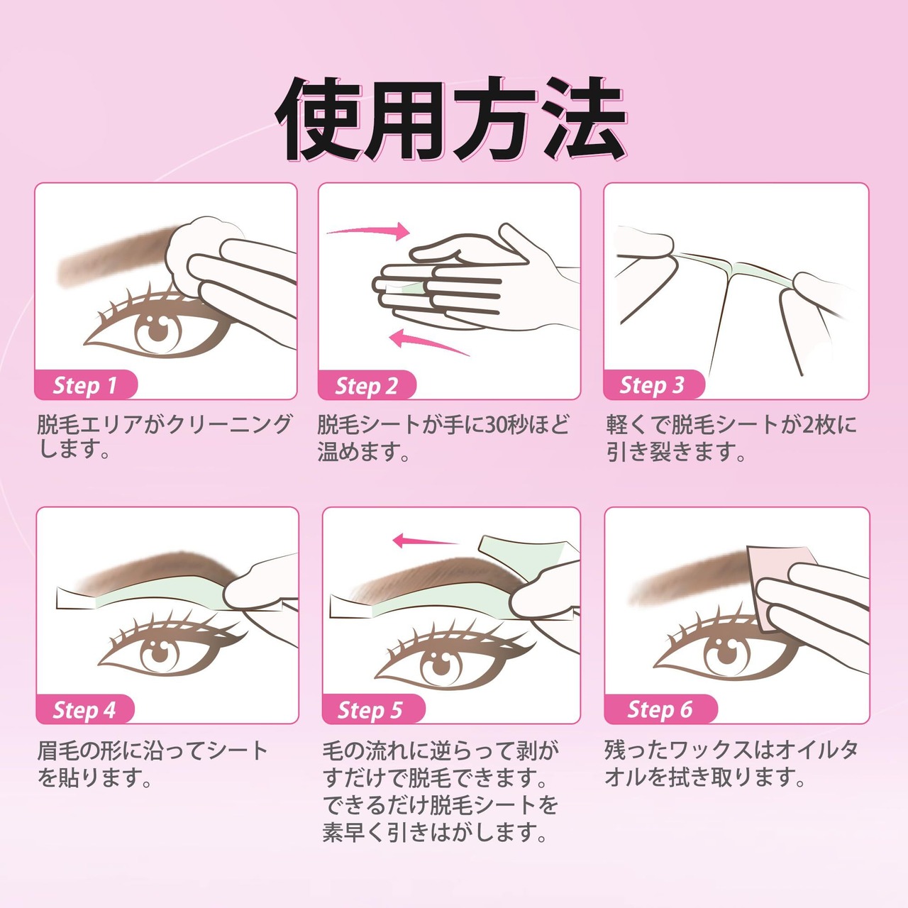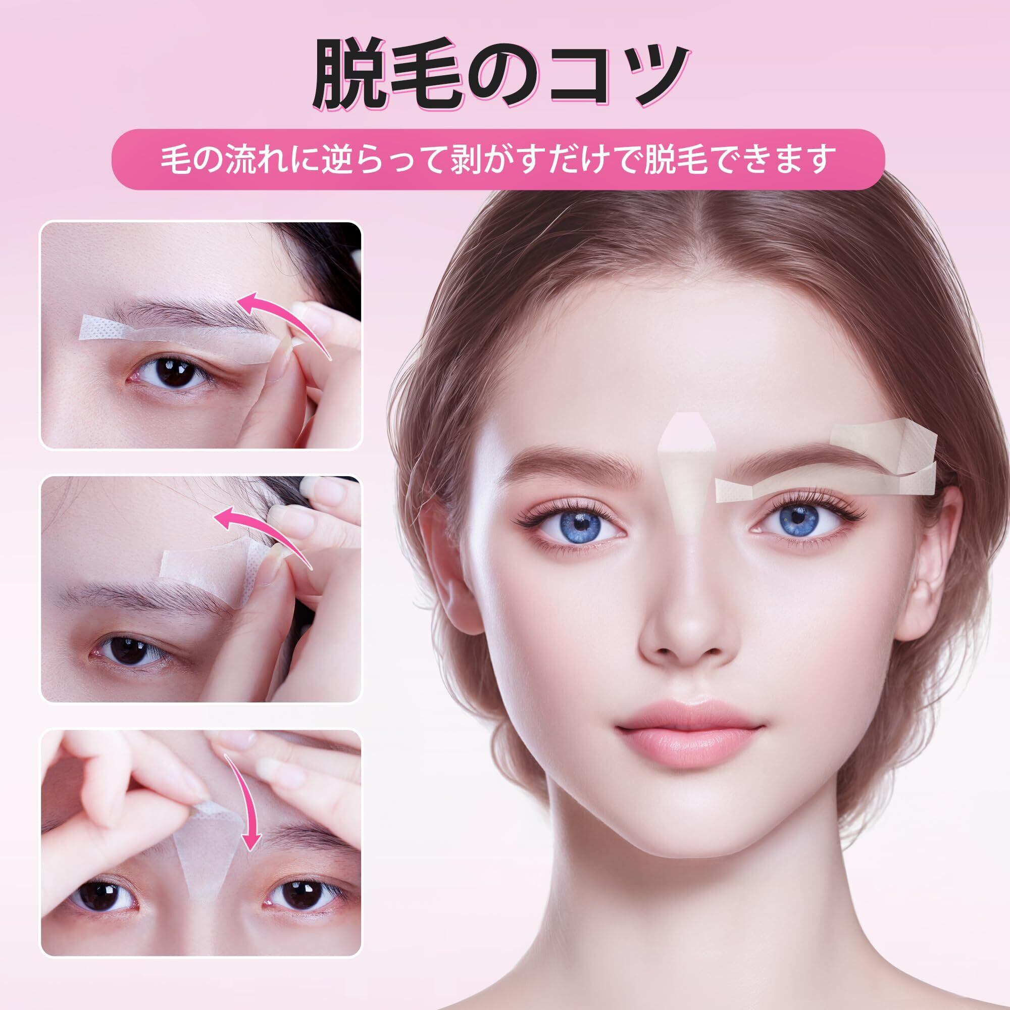 【顔・まゆ毛専用】まゆ毛ために設計された脱毛シートです。口元や眉毛周りにお使いいただけます。顔周りのムダ毛を取り除き、メイクののりもよくなり、すべすべしたはだにしあがります。男性・女性どちらにもおすすめのワックス脱毛シートです。