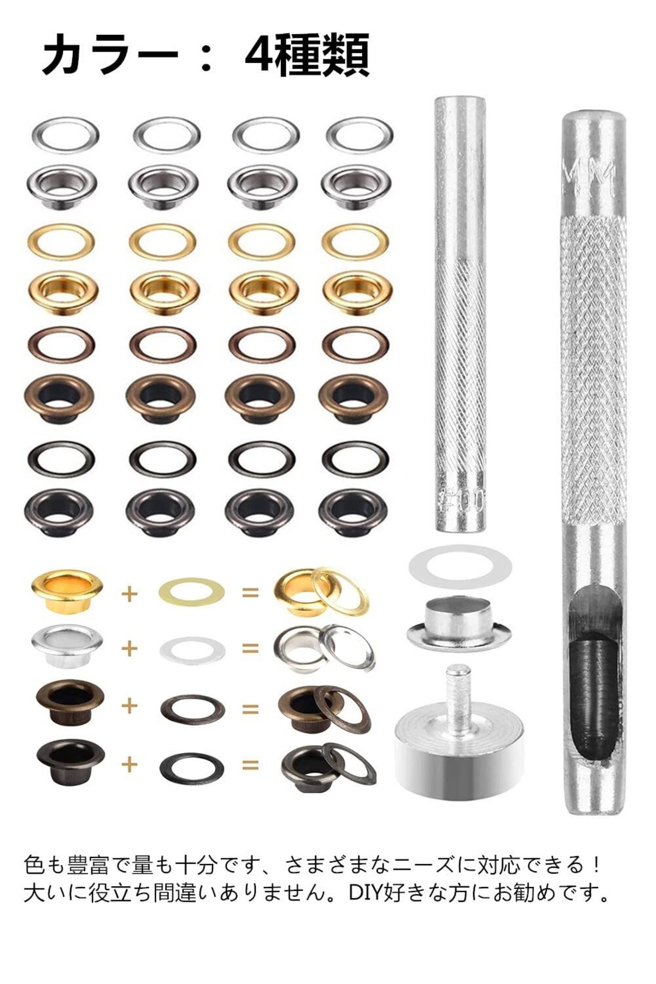 【パッケージ内容】両面ハトメキット *400組、 打ち棒*2、 打ち台*1、 収納ケース*1 。4色:ゴールド、シルバー、古銅色、ガンメタル。サイ ズ :5mm。豊富なアクセサリーがありますから、いろいろな綺麗なレザー工芸品ができます。