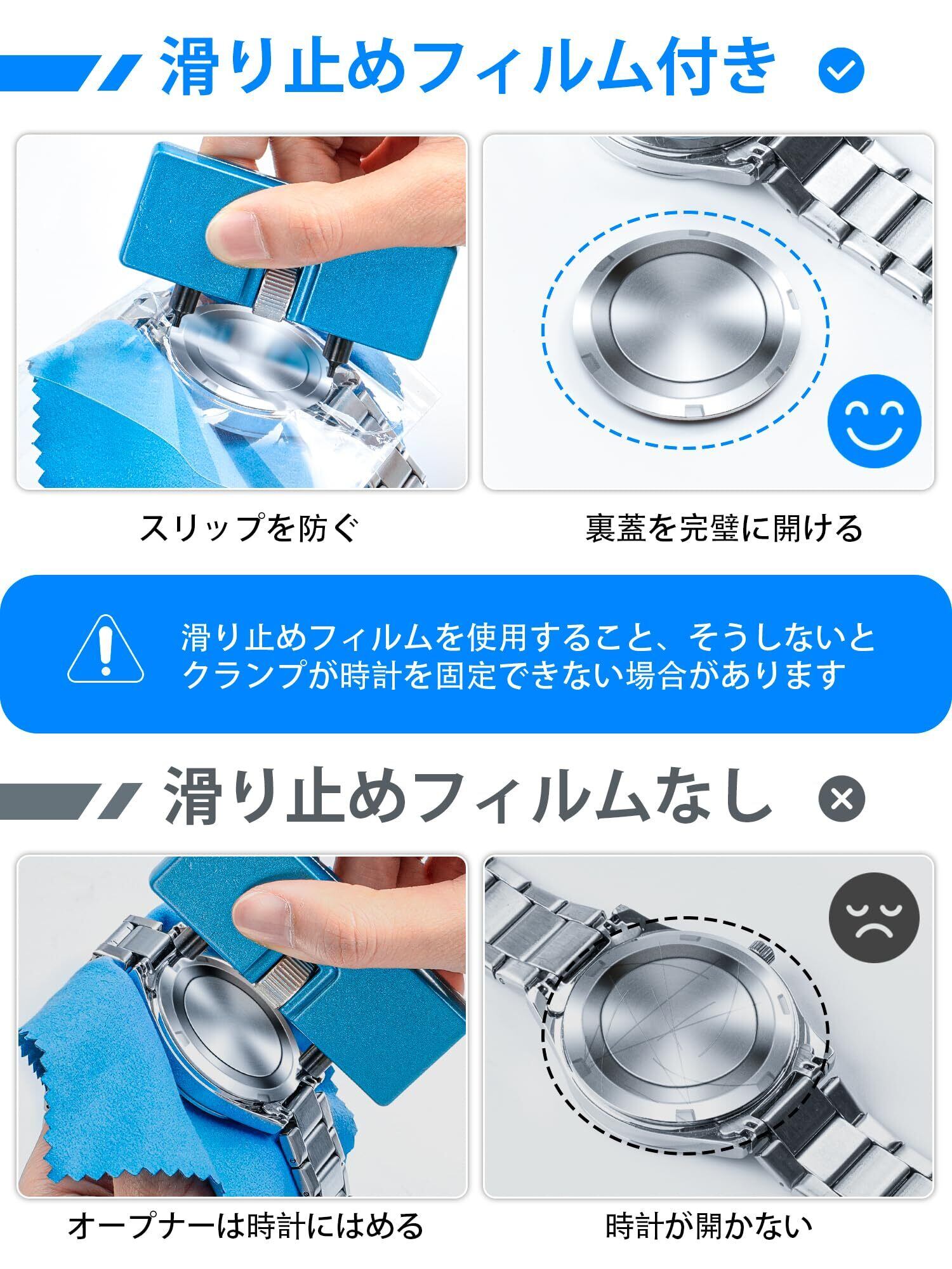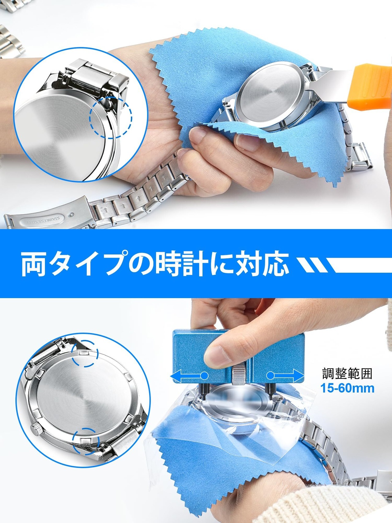 【以下の2種類のウォッチバックを開けることができます。】1. ケースバックに複数のノッチがある時計用の回転式ウォッチ・オープナー。開口範囲は15~60mmで、ダイヤルを回転させることにより、ビットとケースバックの溝との間の距離を調整することができます。2.こじ開け式ウォッチ・オープナー(注:このタイプの時計は、ケースバックを閉じるために追加の時計圧力ツールを購入する必要があります)。