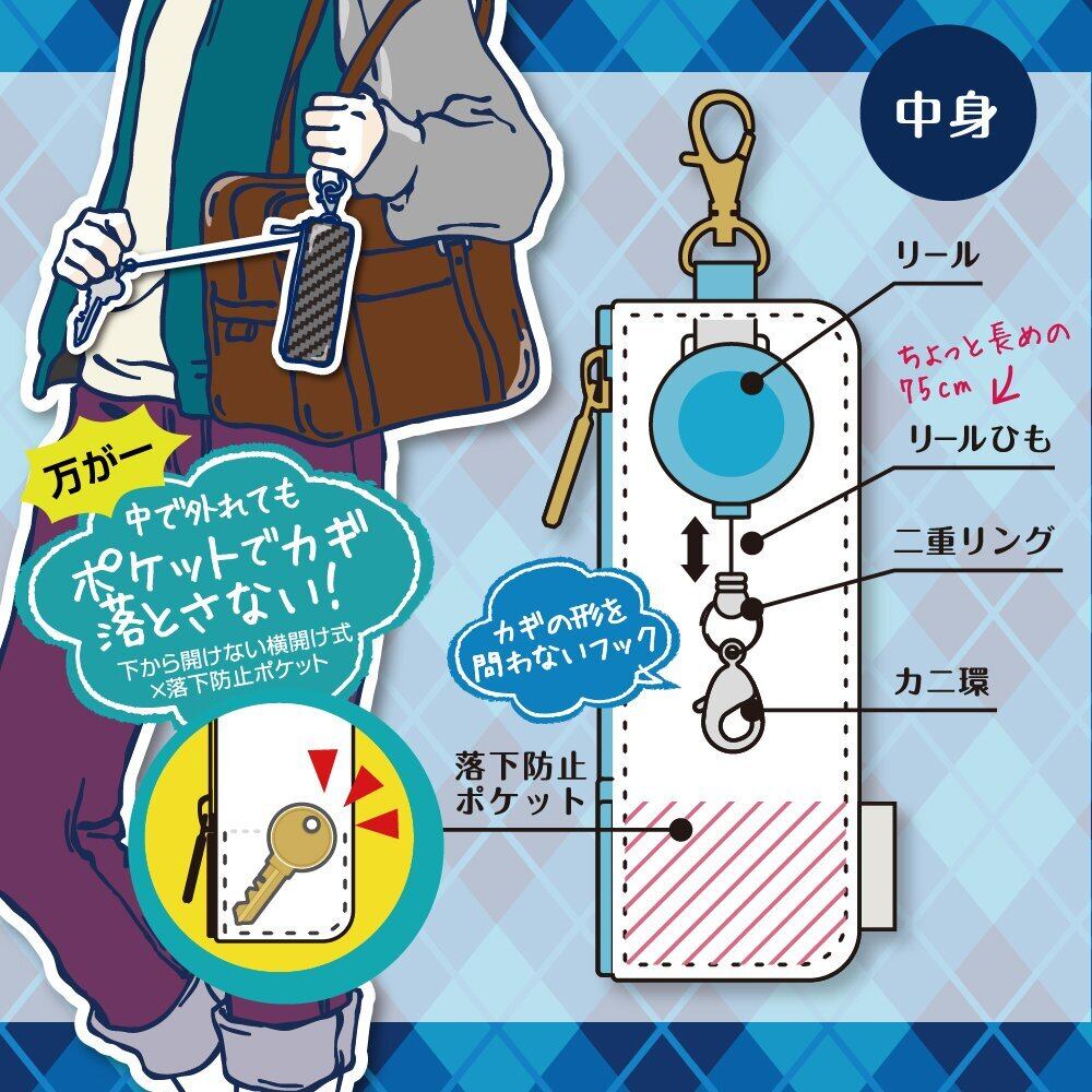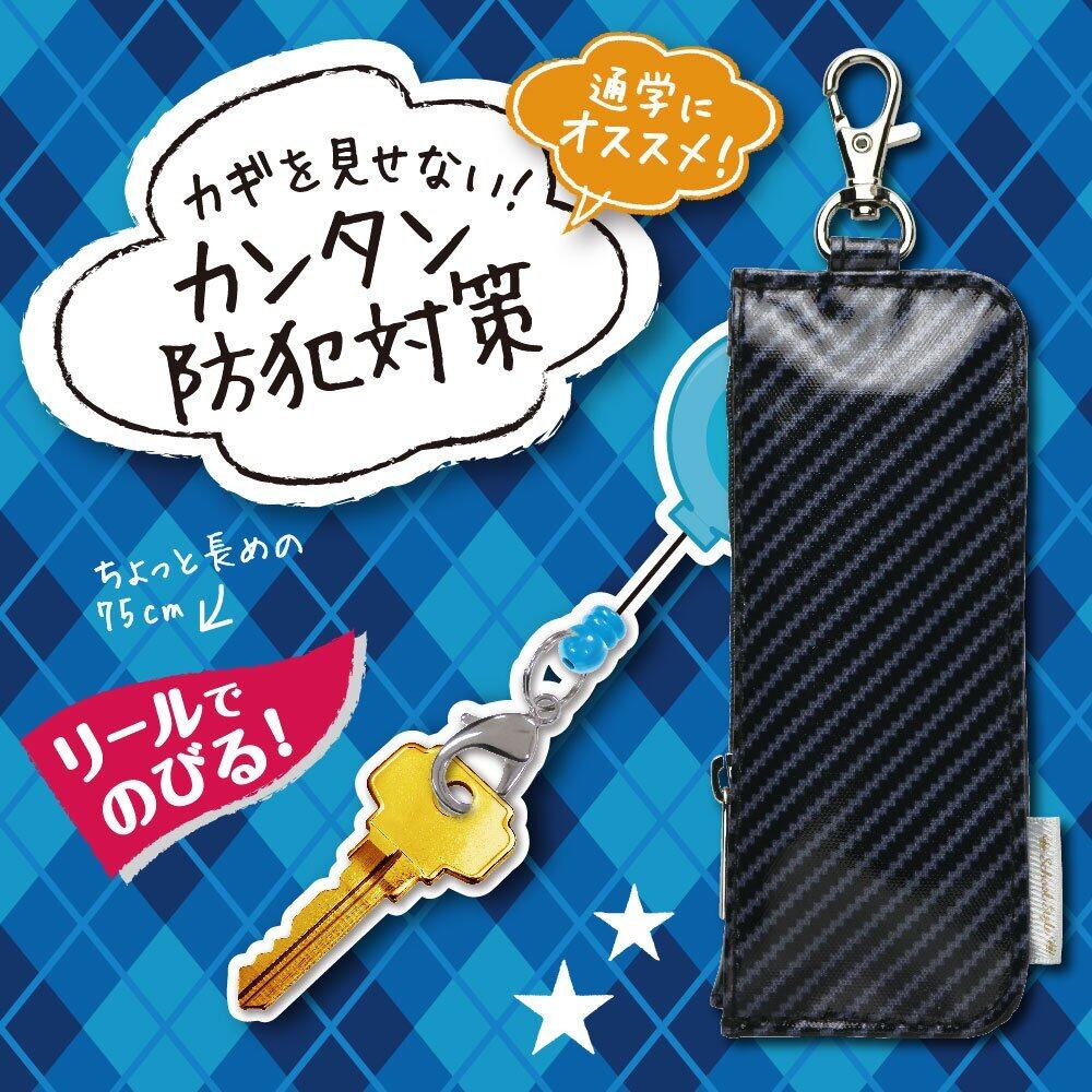 リールで伸びるカギポケット。カギを見せないで持ち運べるので防犯対策に!