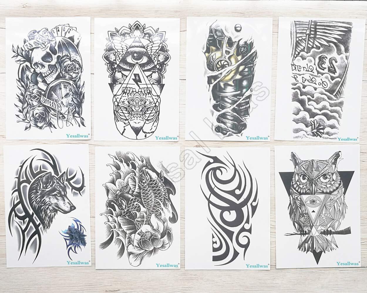 Yesallwas タトゥーシール リアル大判 8枚セット 和柄 和彫り黒 鯉 オオカミ タトゥーステッカー ボディーシール メンズ 入れ墨 シール 刺青シール 防水 腕、足、体、胸、肩、背中に簡単貼る TATOO 15X21CM
