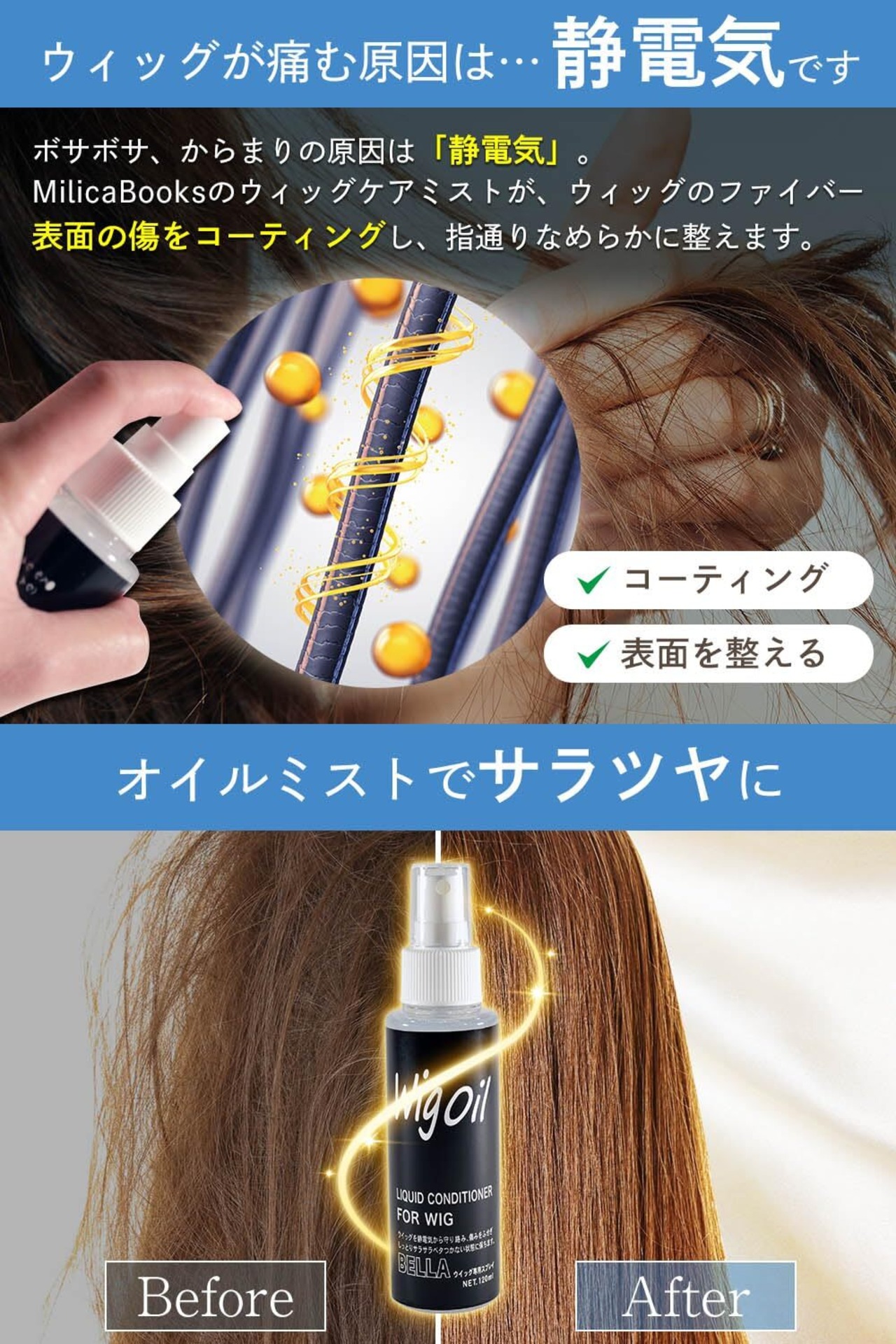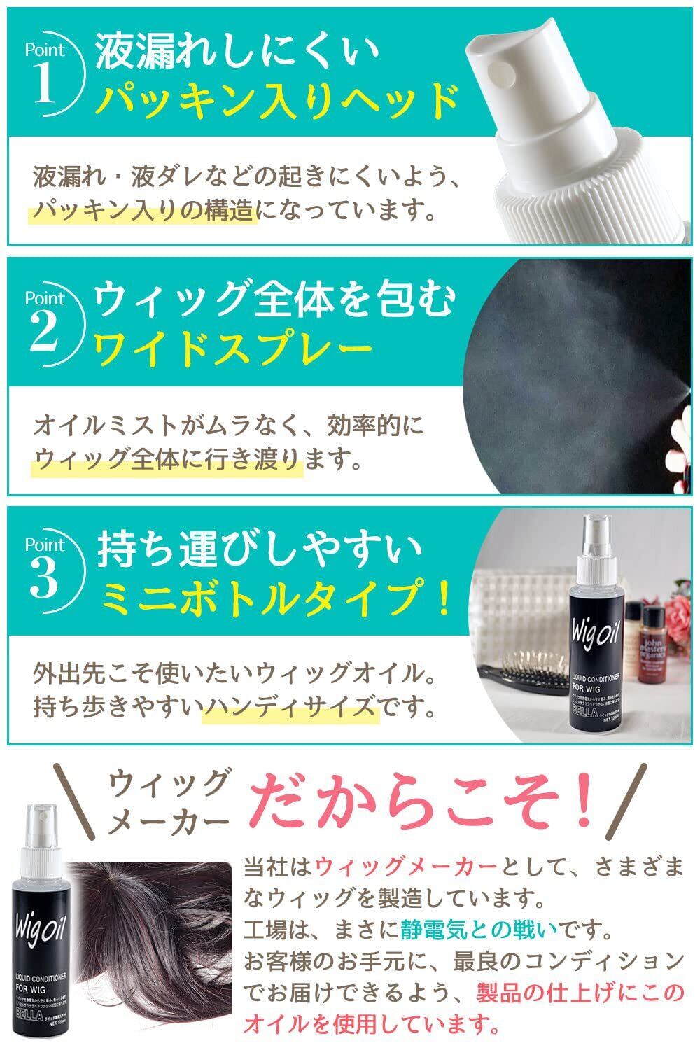 【ウィッグ工場から生まれたウィッグのためのオイル】 ドラッグストアや量販店で販売されている市販ヘアオイルの大半は、ポンプ式です。 そのため、ウィッグに使用するには使いづらいというデメリットがあります。 MilicaBooksウィッグオイルは、細かいミスト状のオイルだからウィッグのケアに最適です。 ウィッグ工場から生まれたウィッグのためのヘアケアオイルです。