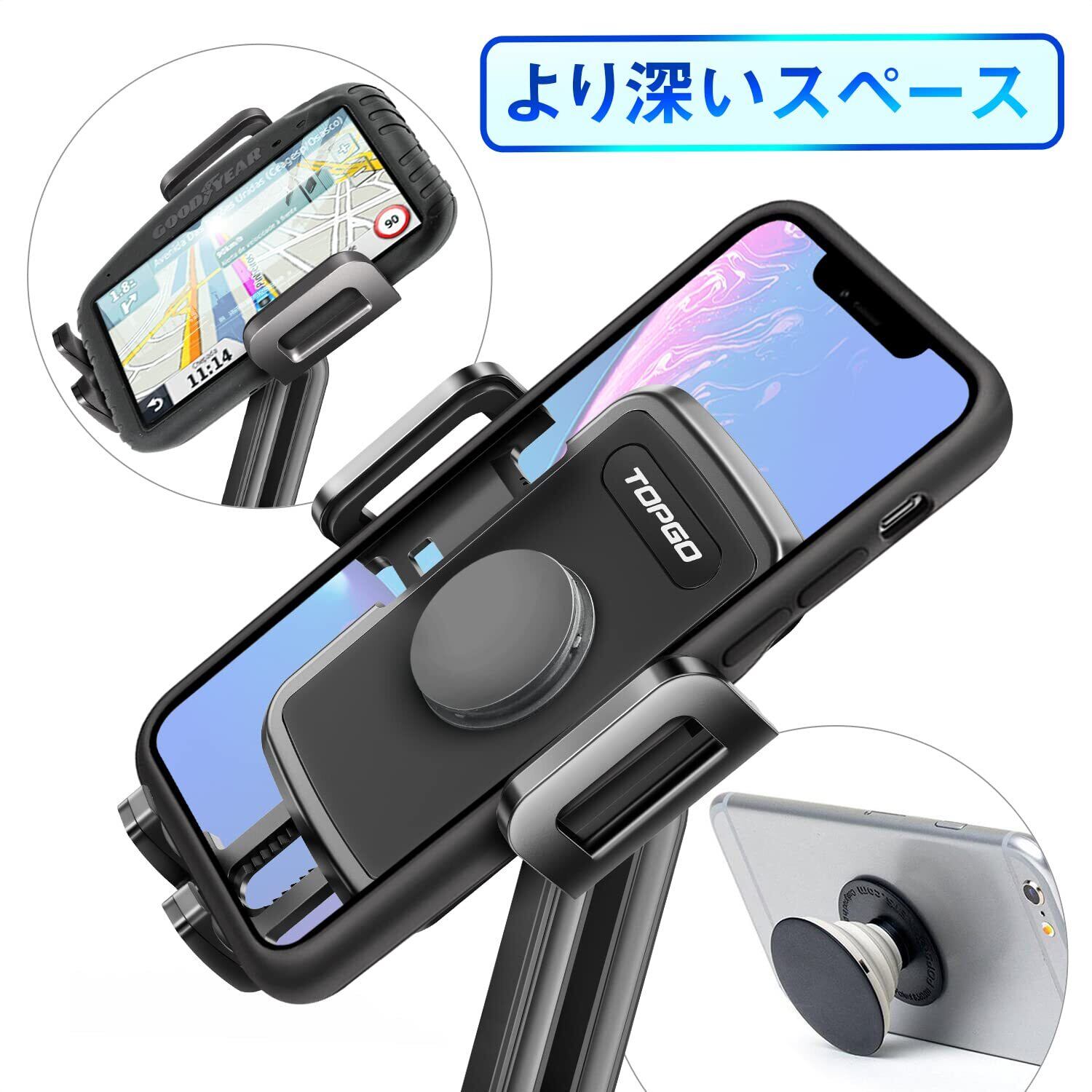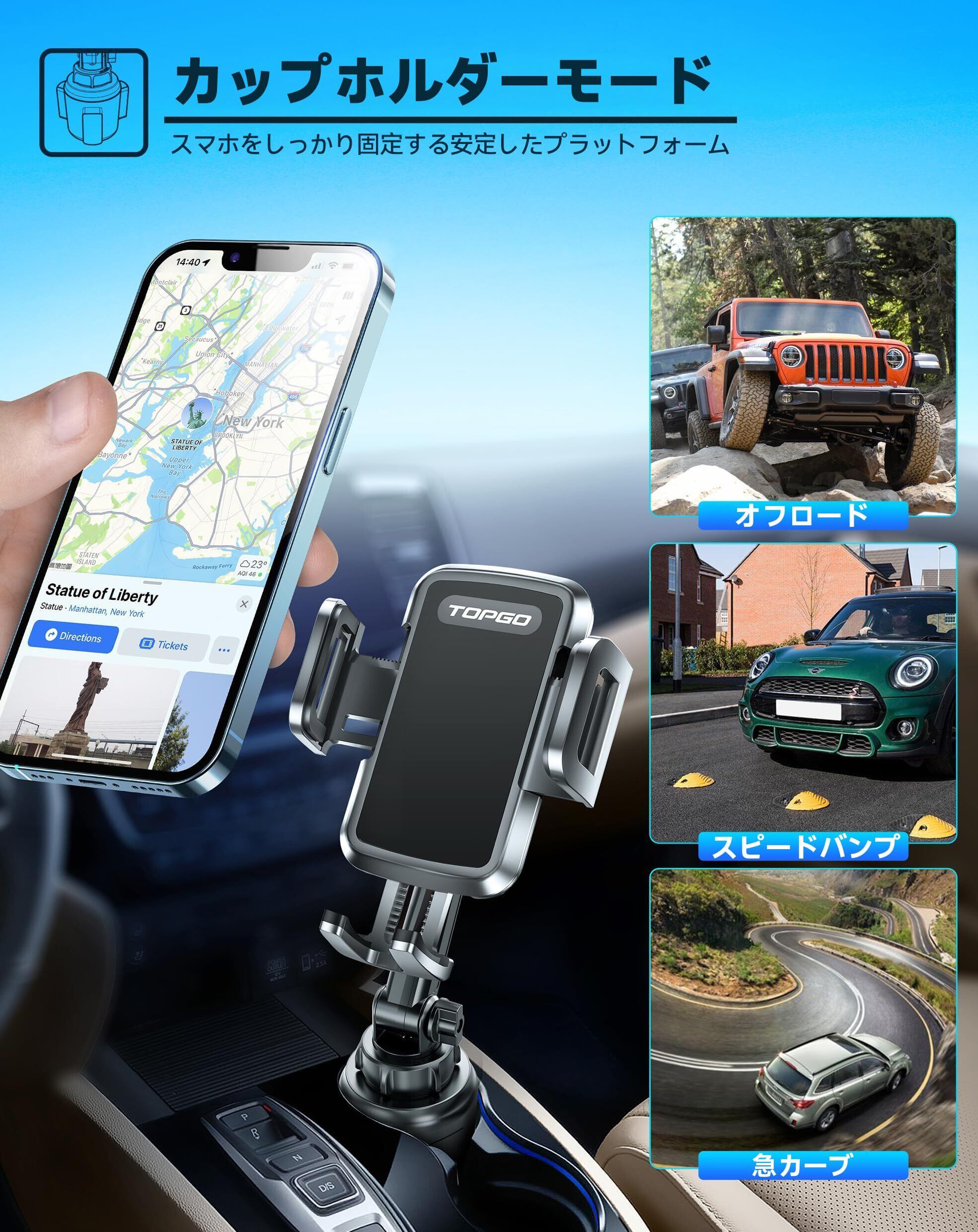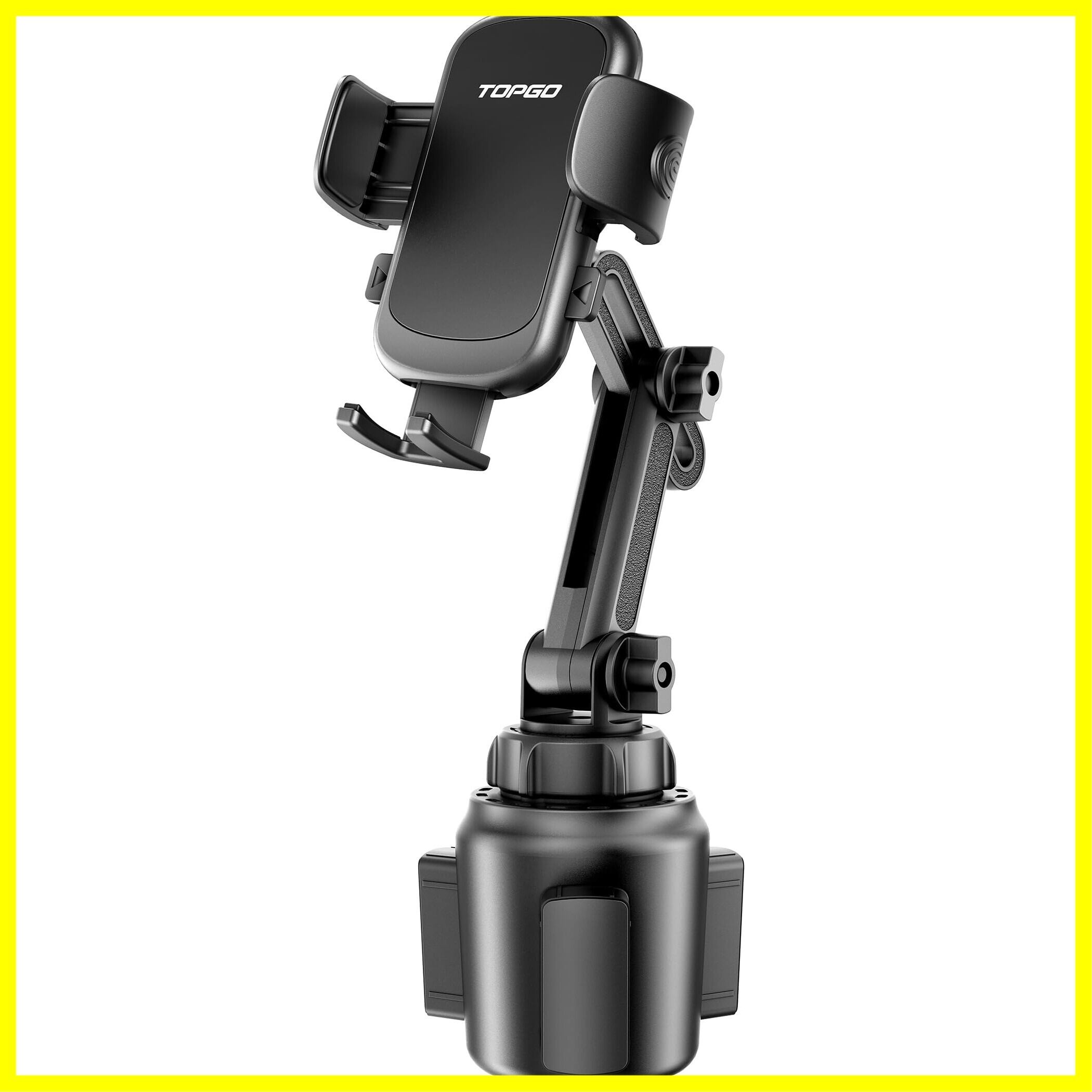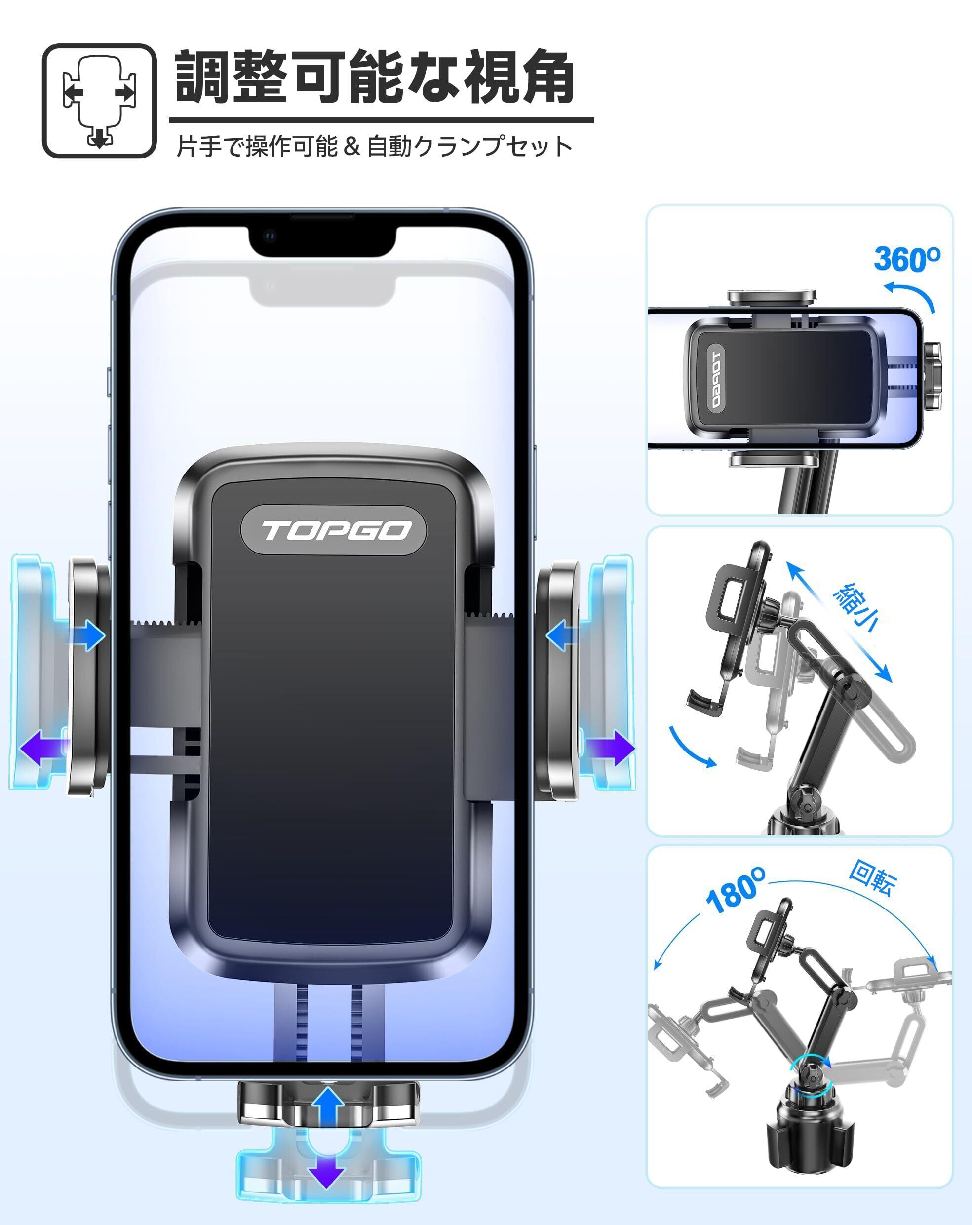 スマホホルダー 車 ドリンクホルダー 車載ホルダー カップホルダー スマホスタンド 車 TOPGO 【 機械式伸縮アーム・安定性 車載 携帯ホルダー 縦・横・上下・左右自在調節 360度回転 片手操作 ワンタッチ iPhone 16 Pro Max/Galaxy S25 Ultra多機種対応(ブラック)