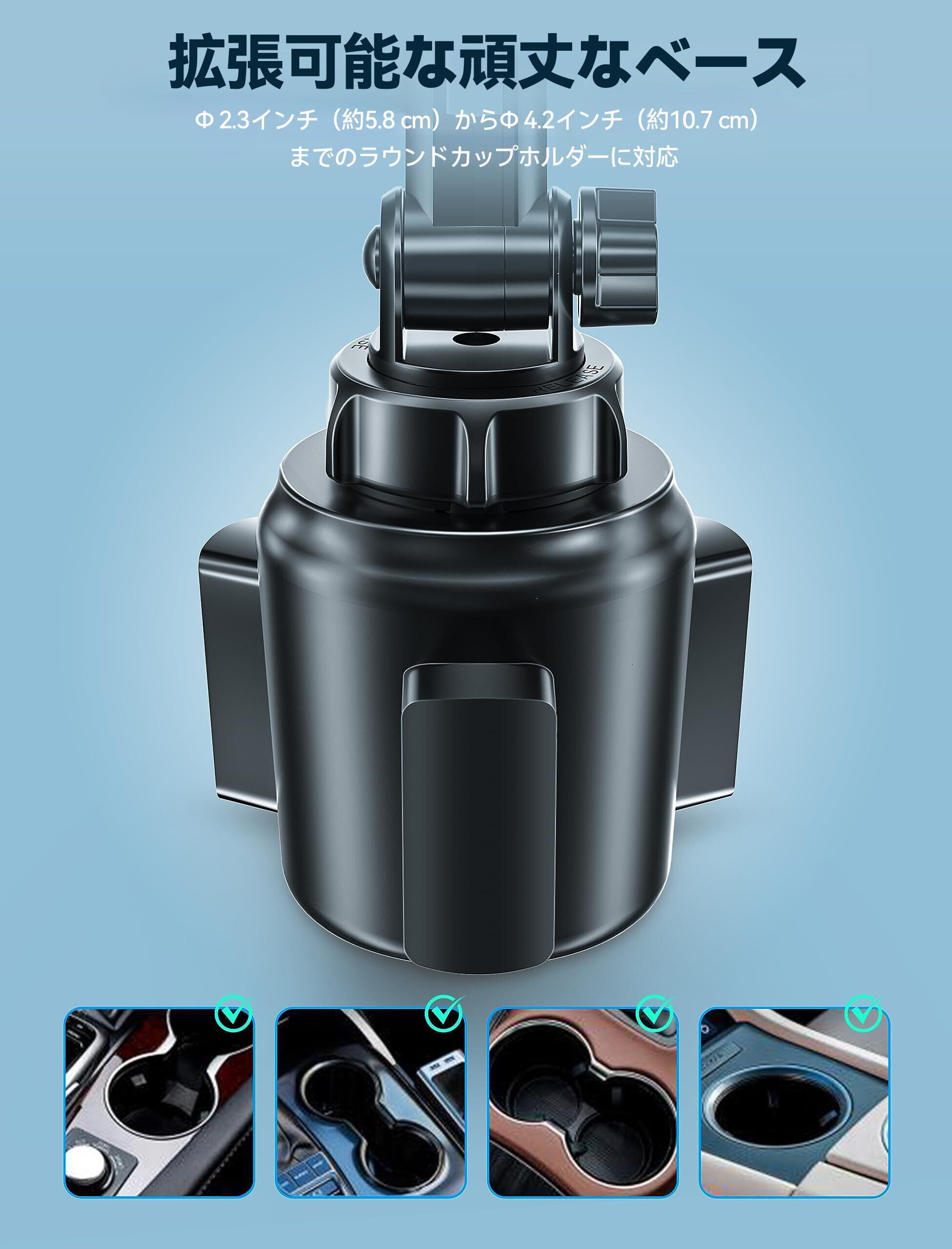 【拡張台座・取り付け簡単】この車載ホルダーには、拡張可能な台座が装備されており、回すことで最大直径10.2cmまでのほぼすべてのカップホルダーにフィットします。自動車、RV、SUV、トラック、タクシー、テスラ、ヨット、ゴルフカートだけでなく、ベビーカー、ランニングマシン、ソファのドリンクホルダーにも対応しています初心者でも工具を必要とせず、簡単に取り付けができ、ハンズフリーで運転を楽しむことができます。
