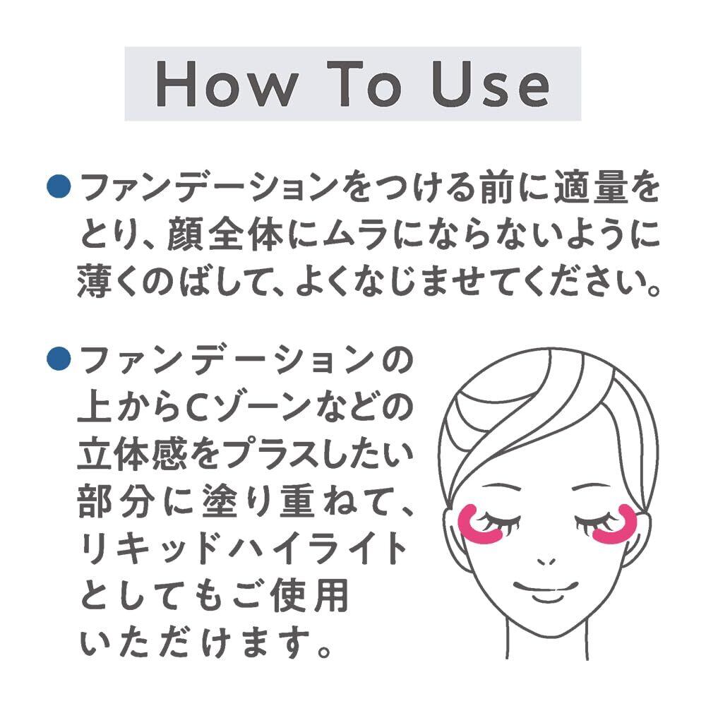 ファンデーションをつける前に適量をとり、顔全体にムラにならないように薄くのばして、よくなじませてください。 ファンデーションの上からリキッドハイライトとしてもご使用いただけます。