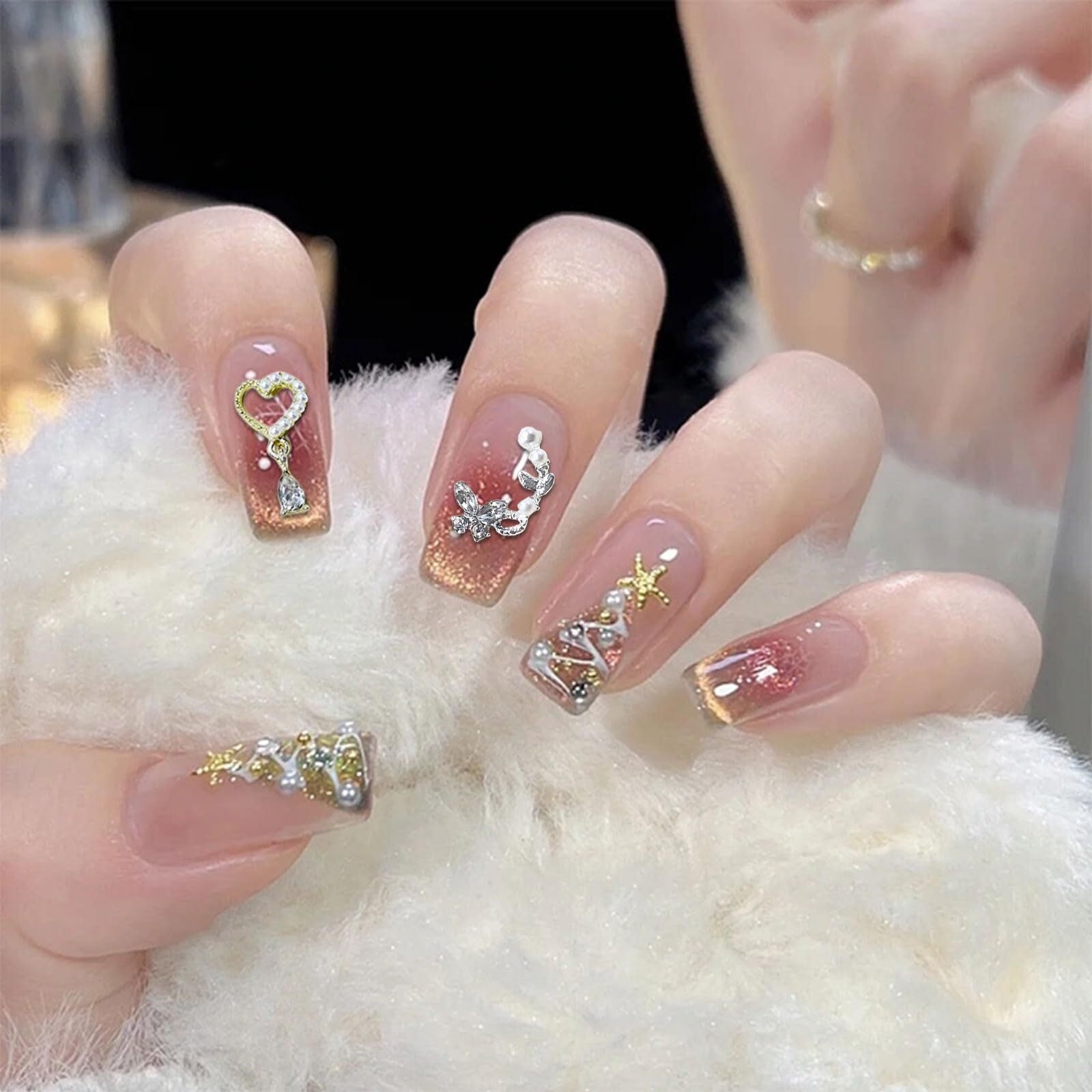 【素材】ネイルパーツは高品質の合金と樹脂素材で作られており、高級感があって、耐久性もあります。軽量で、使いやすいです。季節を問わず幅広くお使いいただけます。