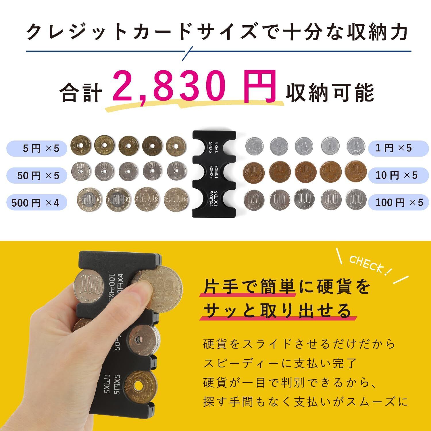 【小銭を分類】 1円硬貨5枚・5円硬貨5枚・10円硬貨5枚・50円硬貨5枚・100円硬貨5枚・500円硬貨4枚。2830円分の硬貨が収納できるコインホルダーです。一目でどの硬貨が何枚あるか簡単にわかるのでとても便利です。