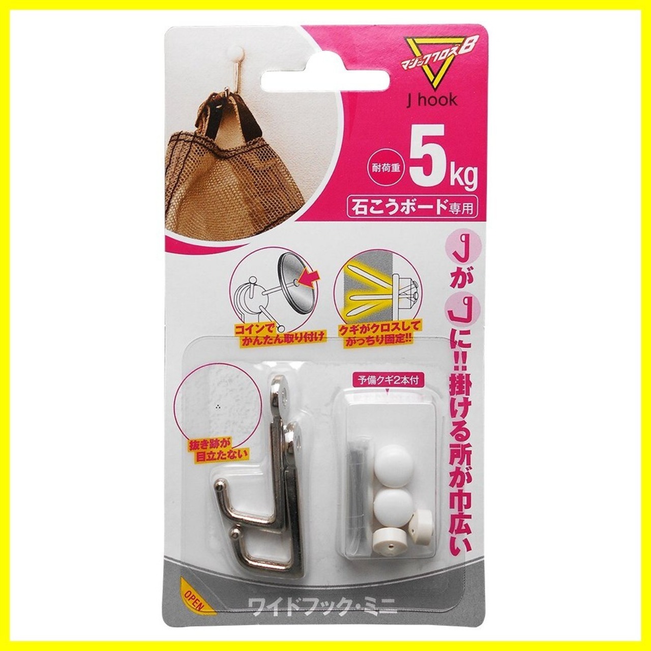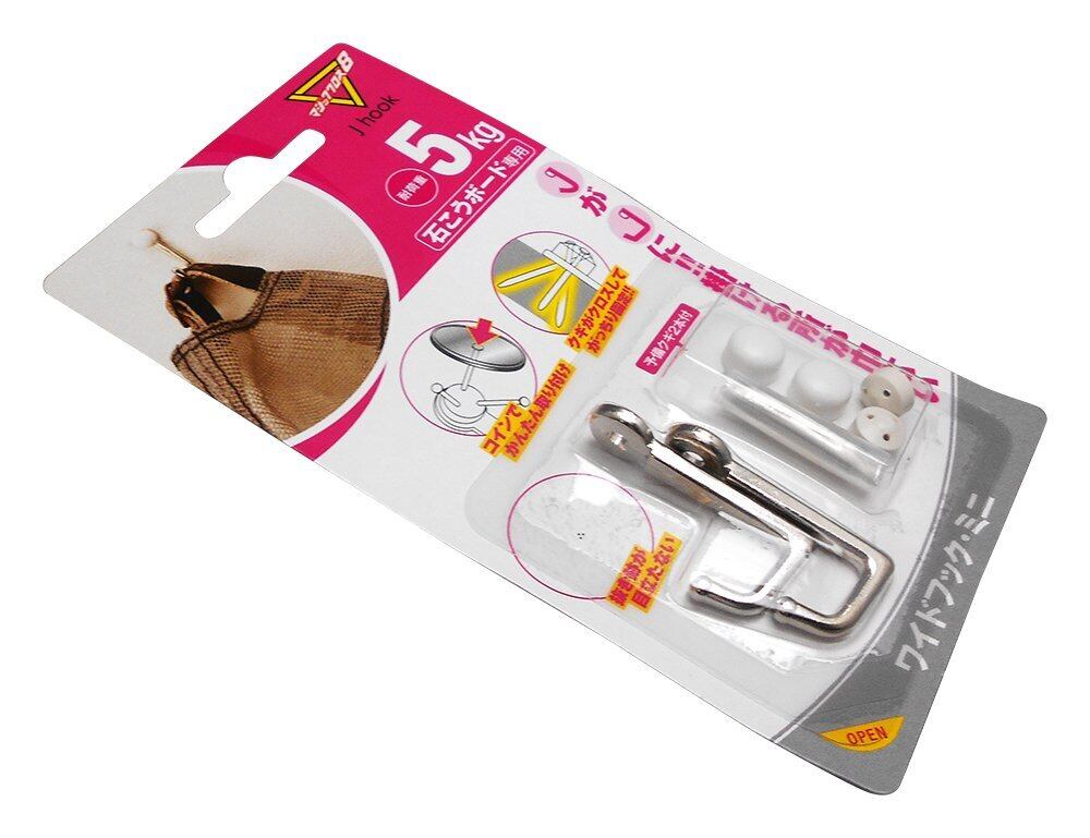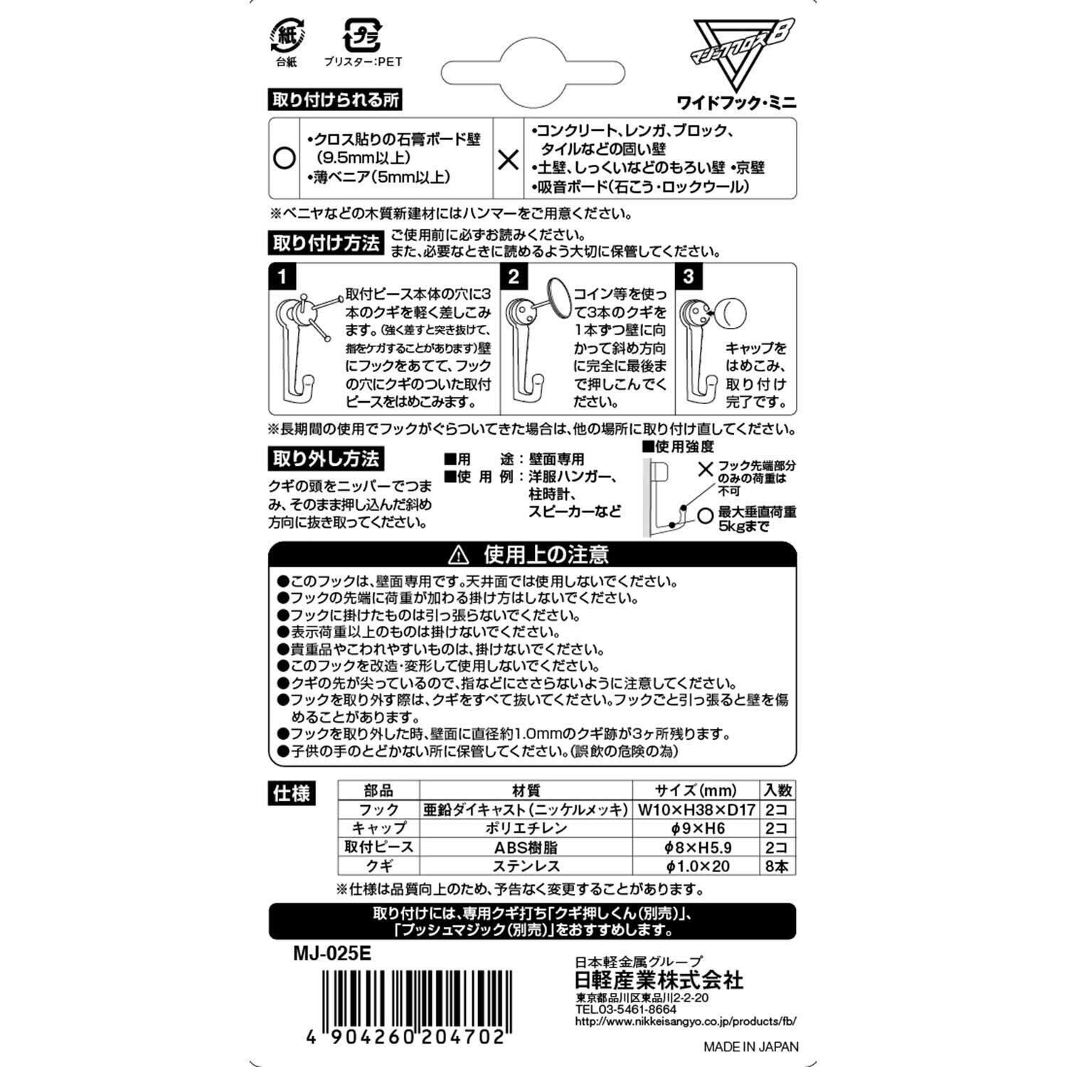 日軽産業 フック マジッククロス8 J hook ワイドフック・ミニ MJ-025E 奥行1.7×高さ3.8×幅1cm キャップ2コ、取付ピース2コ、クギ8本 2個入