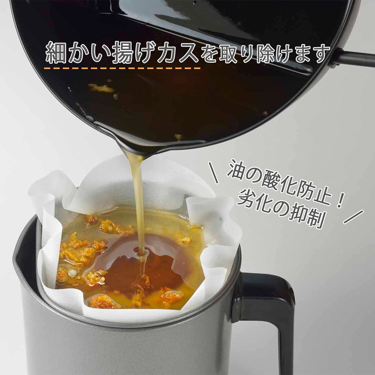 注意1:油は出来るだけ冷めないうちに濾すこと(10分後目安)。冷めた油は、粘度が高くなって濾過速度が遅くなる