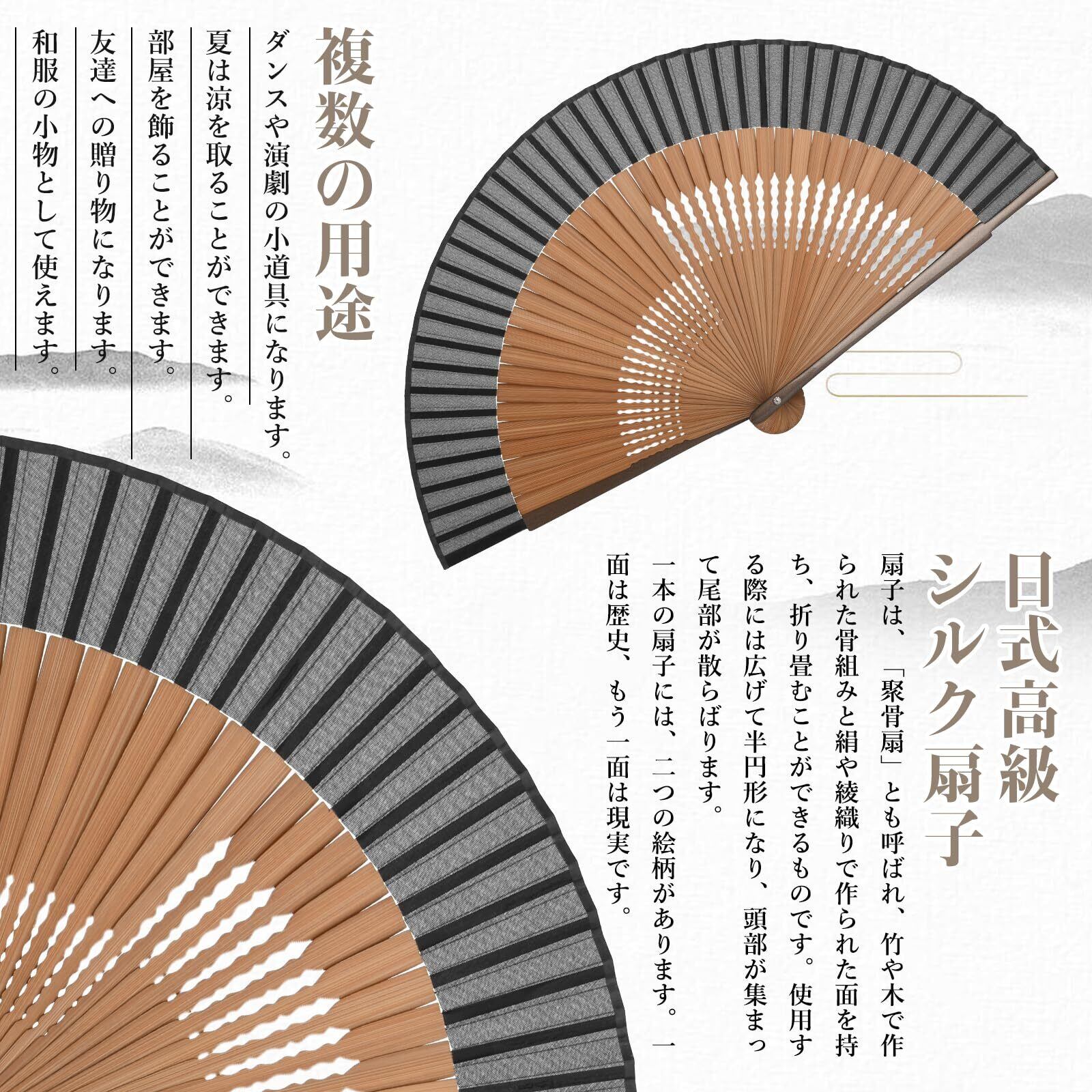 【ポータブルで持ち運びが簡単】この扇子は折りたたみ可能で、コンパクトな構造であり、重量はわずか35グラムです。ギフトボックスと収納袋が付属しており、扇子を保護するだけでなく、贈り物にも使えます。