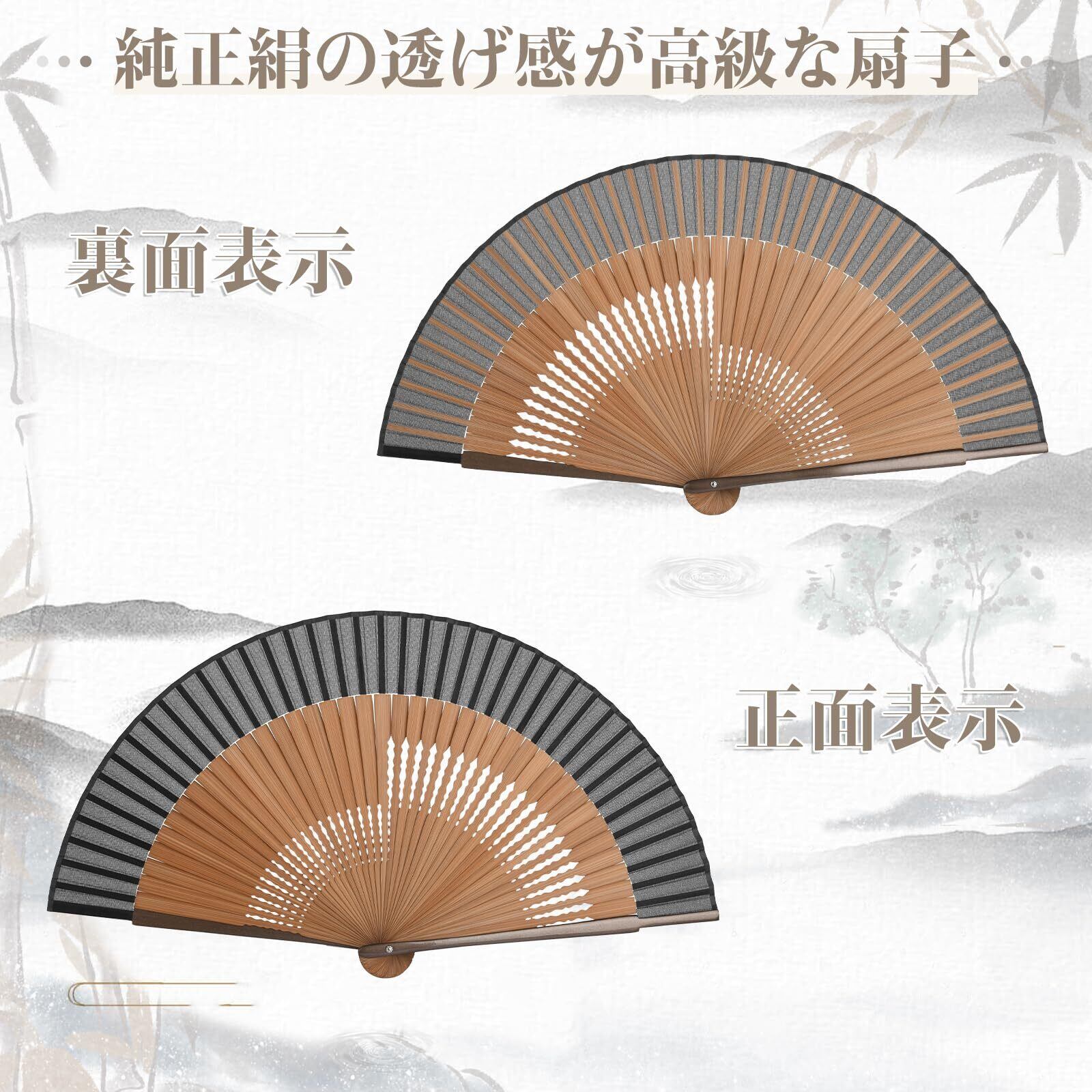 【素材】扇骨はアシ竹を使用し、扇面はシルクの生地を使用しています。これにより、折りたたみ扇子は優れた品質を持ちながら、自然の美しさと洗練を失わずにいます