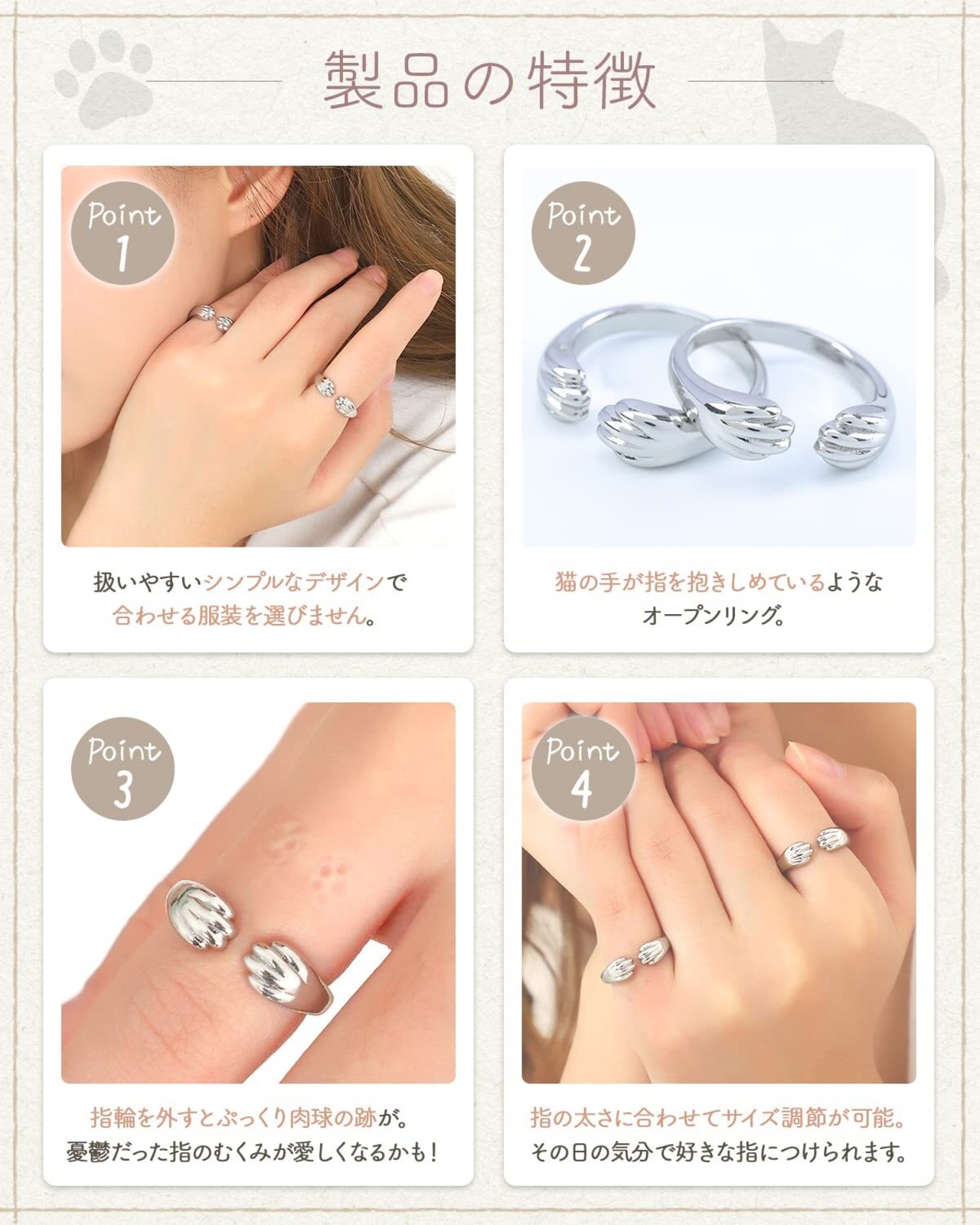 [ケーエルユー] 猫 指輪 肉球 跡が残る フリーサイズ リング 調節可能 ファッションリング 人気