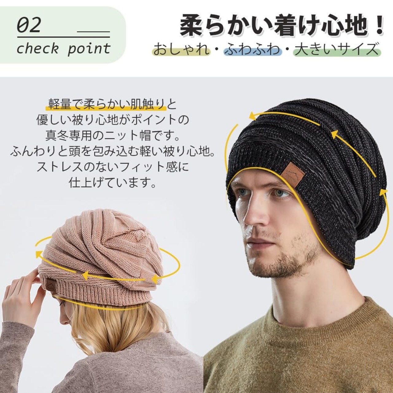 【快適・柔らかい】軽量で柔らかい肌触りと優しい被り心地がポイントの真冬専用のニット帽です。ふんわりと頭を包み込む軽い被り心地。ストレスのないフィット感に仕上げています。長時間かぶっても、窮屈感もなく、ゆったりとかぶれるサイズ感。