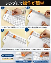 【使い方は簡単】透明の紙押さえ板でカットしたい紙を挟み、スライダーを下までスッとおろすだけ!家庭、オフィス、プリントショップ、DIYに適しています。硬いボール、カード、写真などを裁断できます。自宅やオフィスでも活躍するアイテム。資料や用紙の裁断、事務作業などにとっても便利です。※裁断できないもの:湿った紙、薄い紙(和紙、ティッシュペーパー) クリップ、ホッチキス、粘着剤などがついた紙。