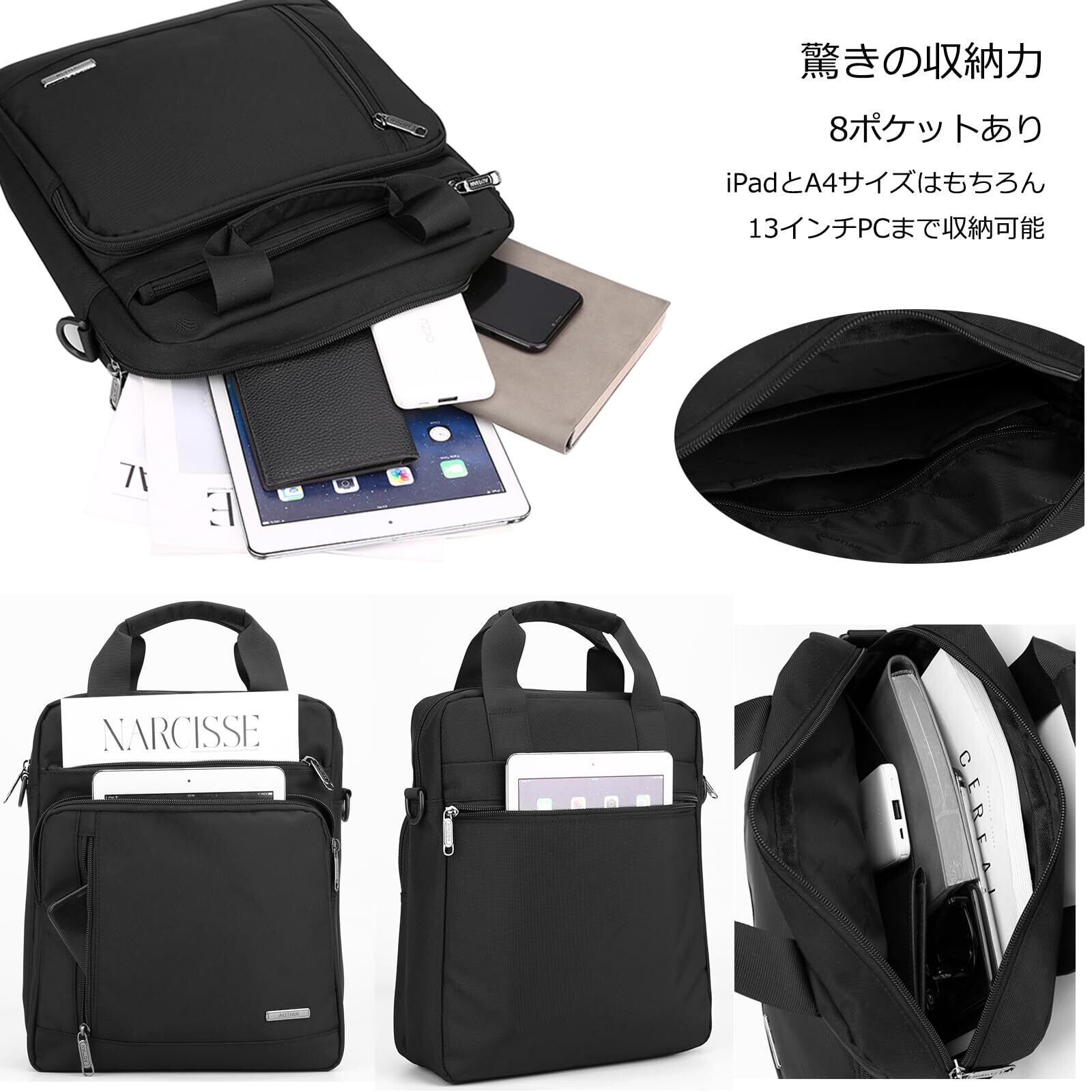 【たっぷり大容量&8ポケット】A4サイズの書類は勿論、ビジネスには必要の13型ノートPCも楽々入る大容量です。ポケットも多く、整理しやすくて、手帳、スマートフォン、折り畳み傘、財布など必要な物が十分入るからこれ一つでお出かけ可能です。