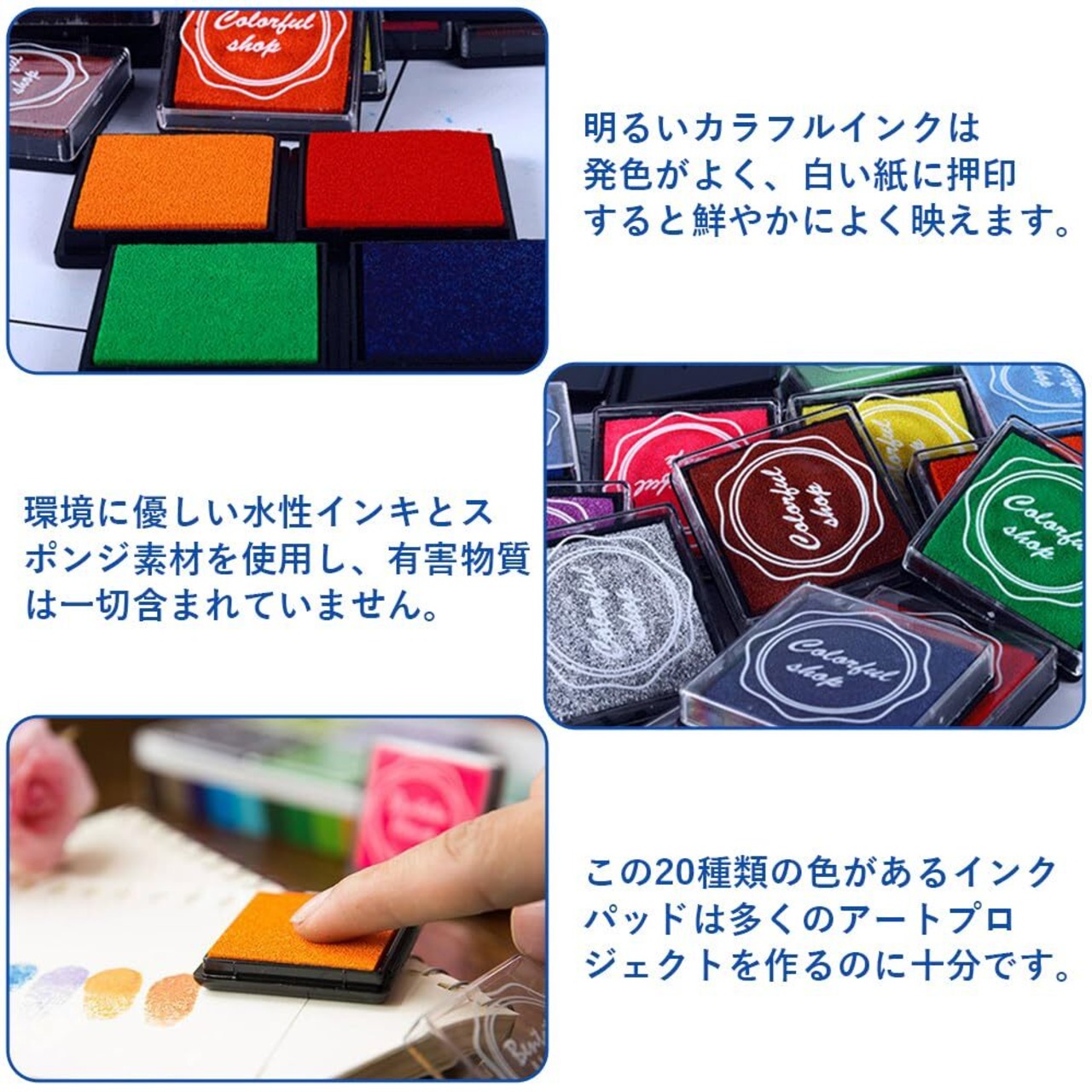 【色鮮スタンプ台】20種類の鮮やかな色を提供し、子供たちの想像力と創造力を思う存分に引き出すことができます。絵を描いたり、手帳を作ったりする際に、異なる色を混ぜたり塗ったりすることで、多様な作品を創造することができます。