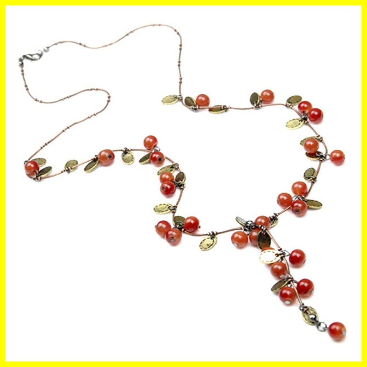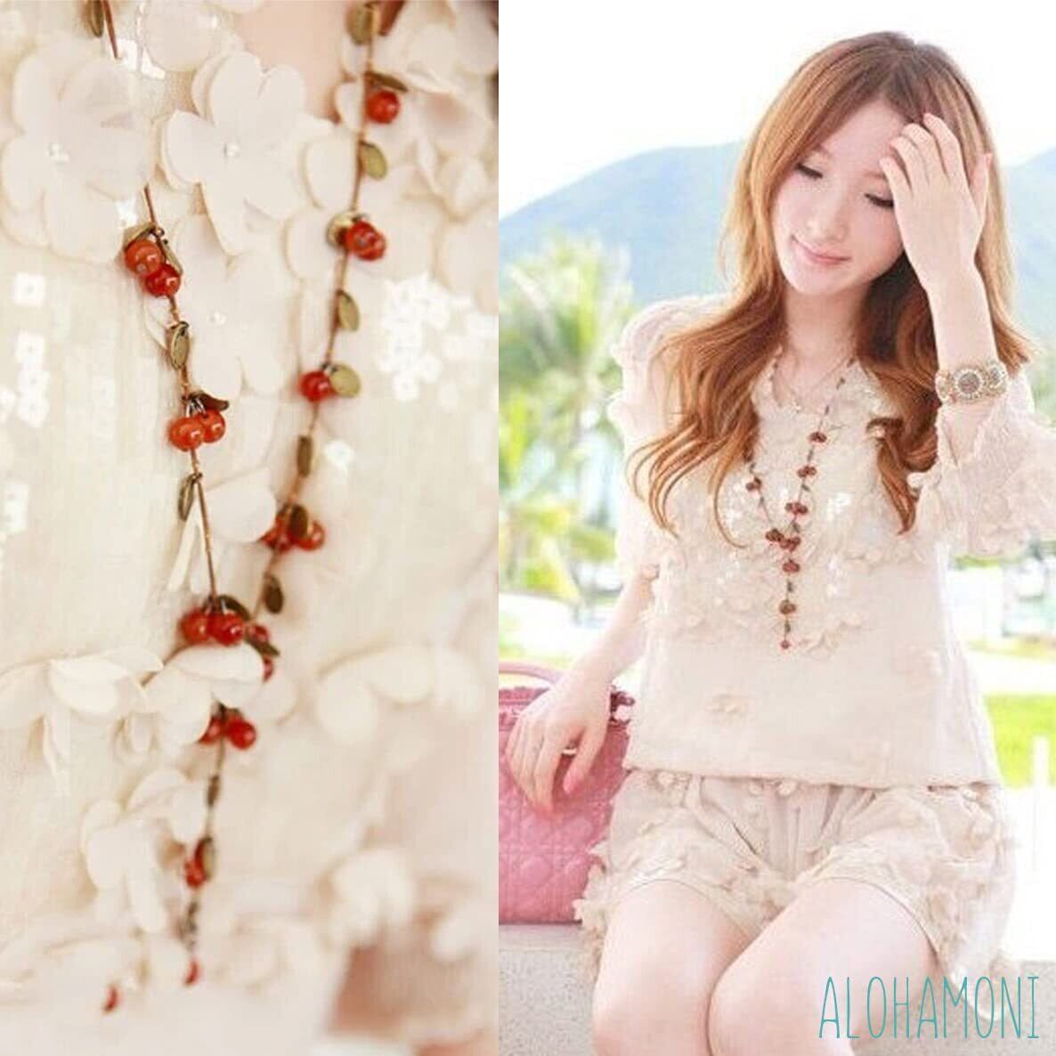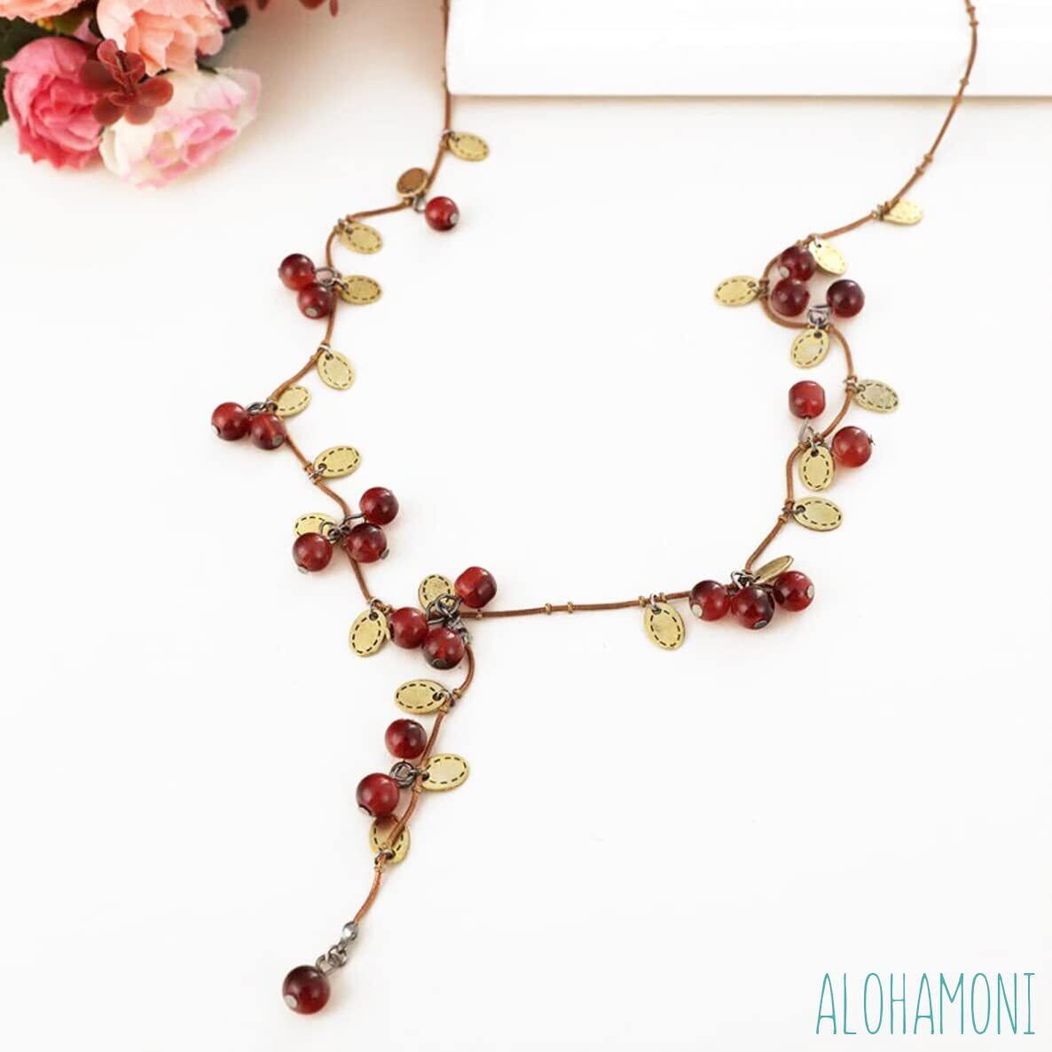 [ALOHAMONI] アロハモニ ヴィンテージ 木の実 ロングネックレス 葉っぱ チェリー アンティーク さくらんぼ チェーン コッパーカラー 小ぶり 華奢 シンプル デザイン ペンダント 森ガール
