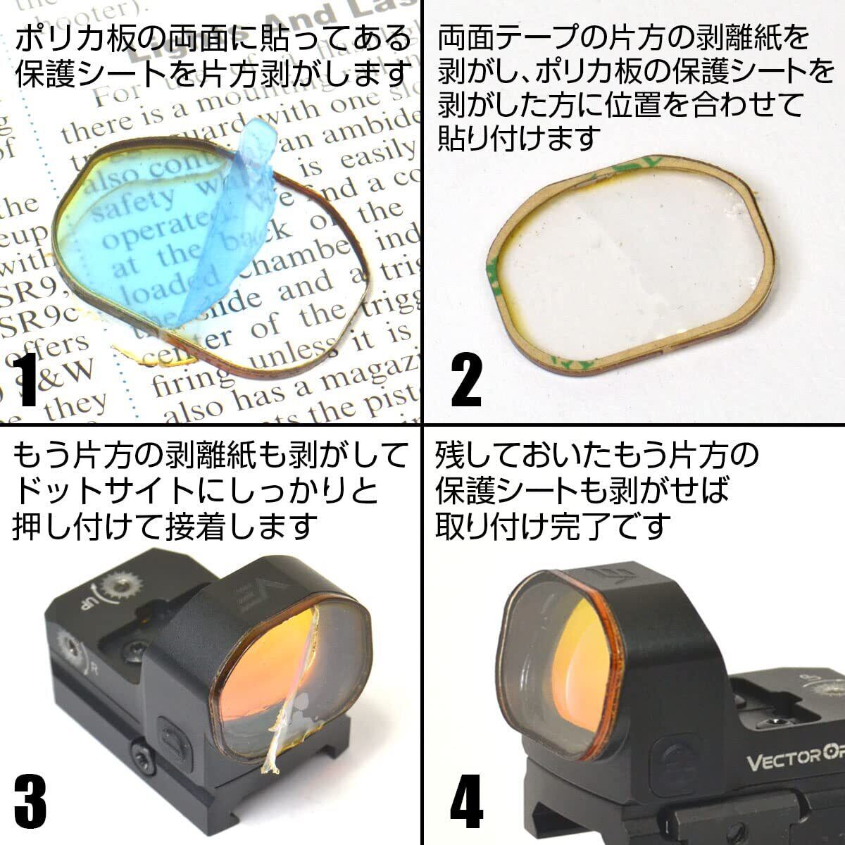 VectorOptics Frenzy2(1x20x28 SCRD-35)用。ドットサイトのレンズをサバイバルゲームでの被弾から守るポリカーボネート製のプロテクターです。付属する超強力両面テープを使って固定します。