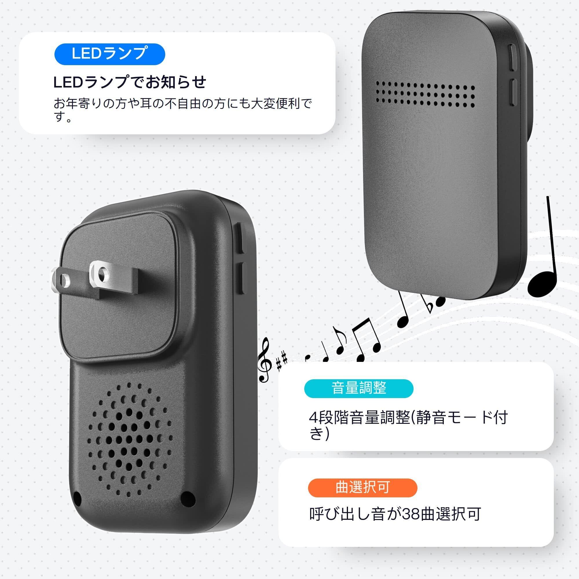 【38曲4段階音量調節と光でお知らせ】このワイヤレスチャイムの送信機を押すと、受信機が音を立てながら両方のライトが点滅してお知らせします。 この玄関チャイムは38種類の音色の曲と0-100DBの4段音量を選ぶことができます。自分の好みや使う場所に合わせて、適切な音量を選ぶことができて、とても便利です。