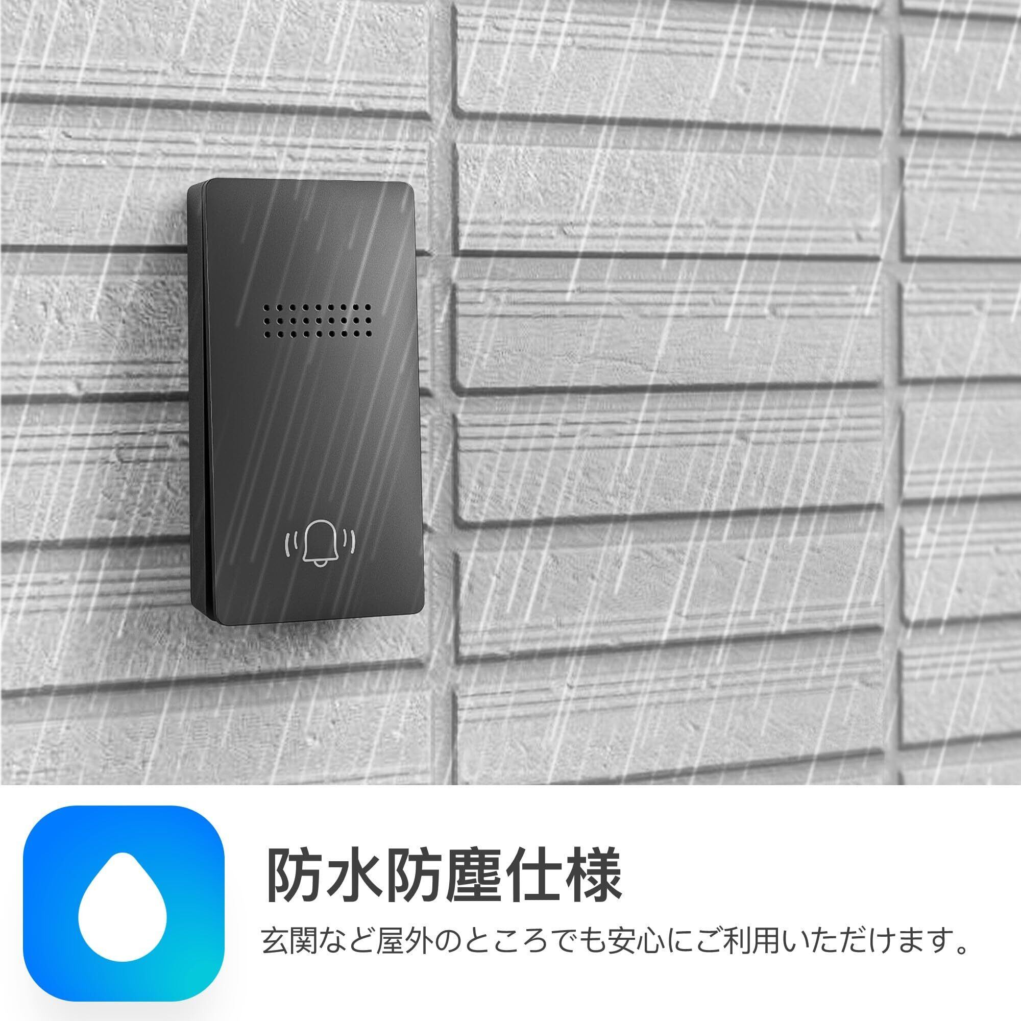 【耐水防塵仕様】この玄関チャイムの送信機はの耐水防塵内部構造を採用しており、屋外や浴室など水がかかる場所で使用しても大丈夫です。雨や水しぶきが直接的にドアベルにかかっても、内部の回路や部品が損傷することなく正常に機能します。これにより、長期間にわたって信頼性のある通知装置として使用できます。
