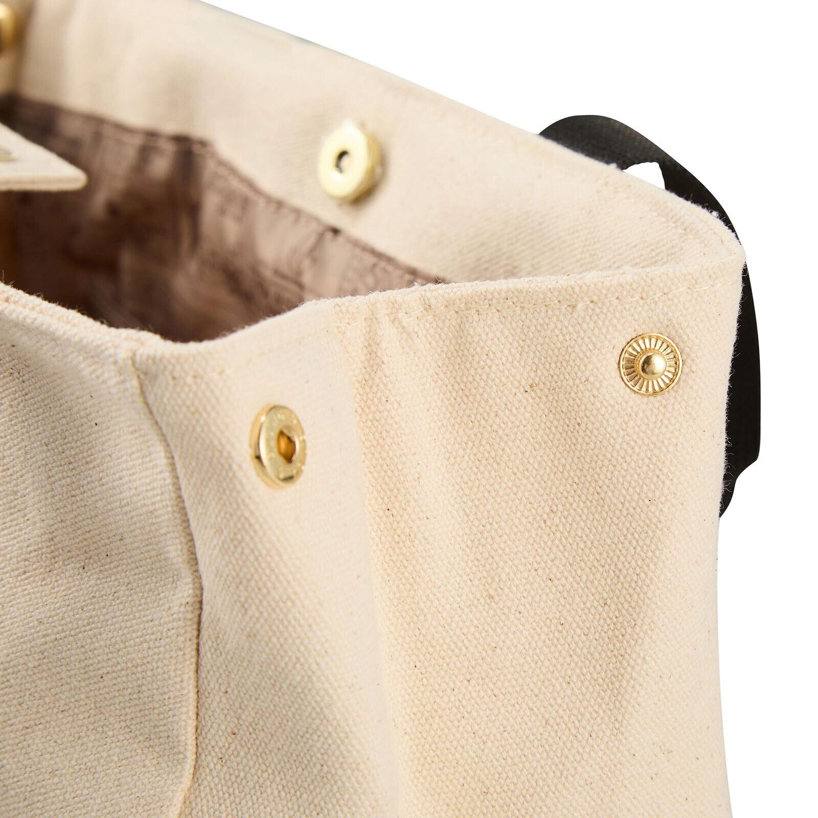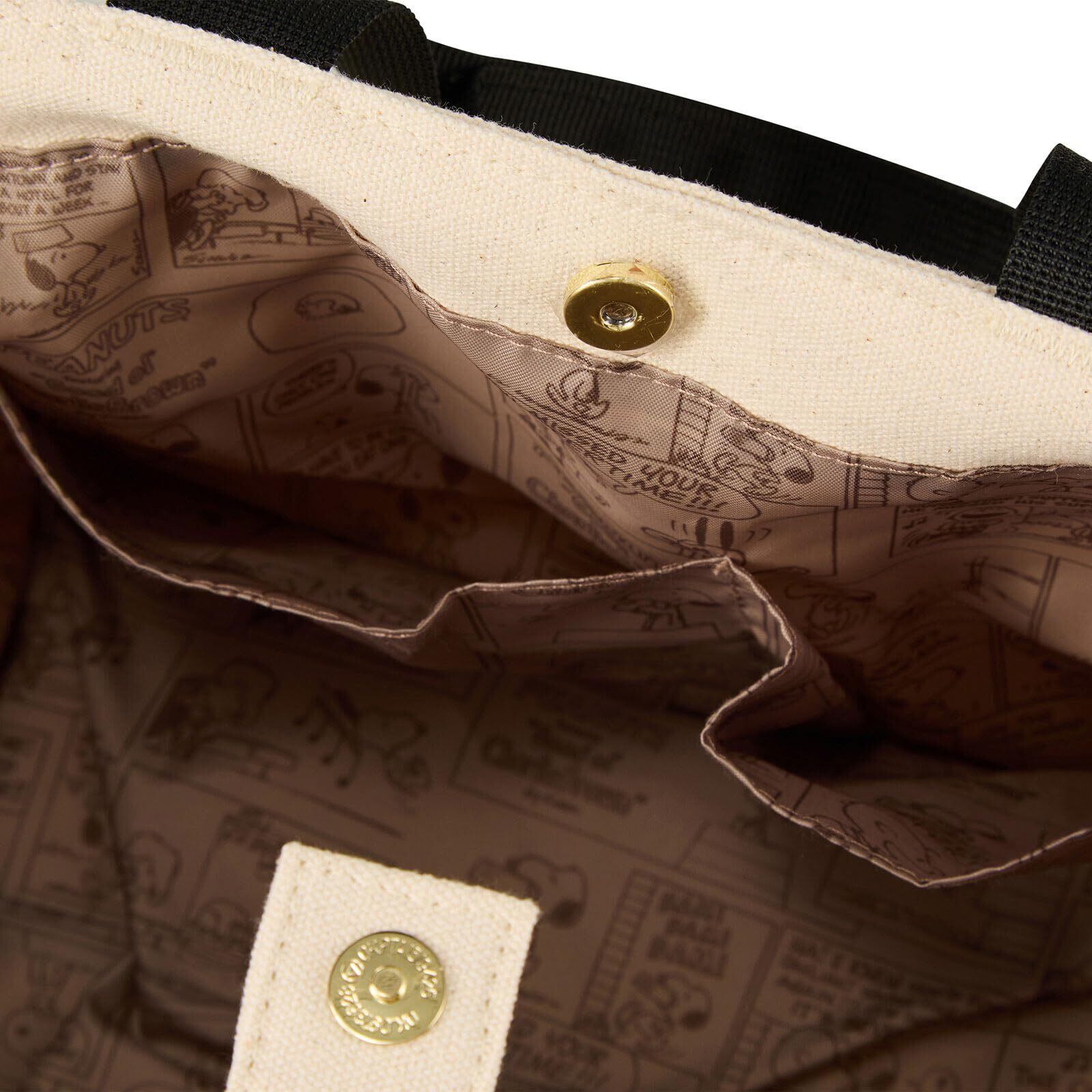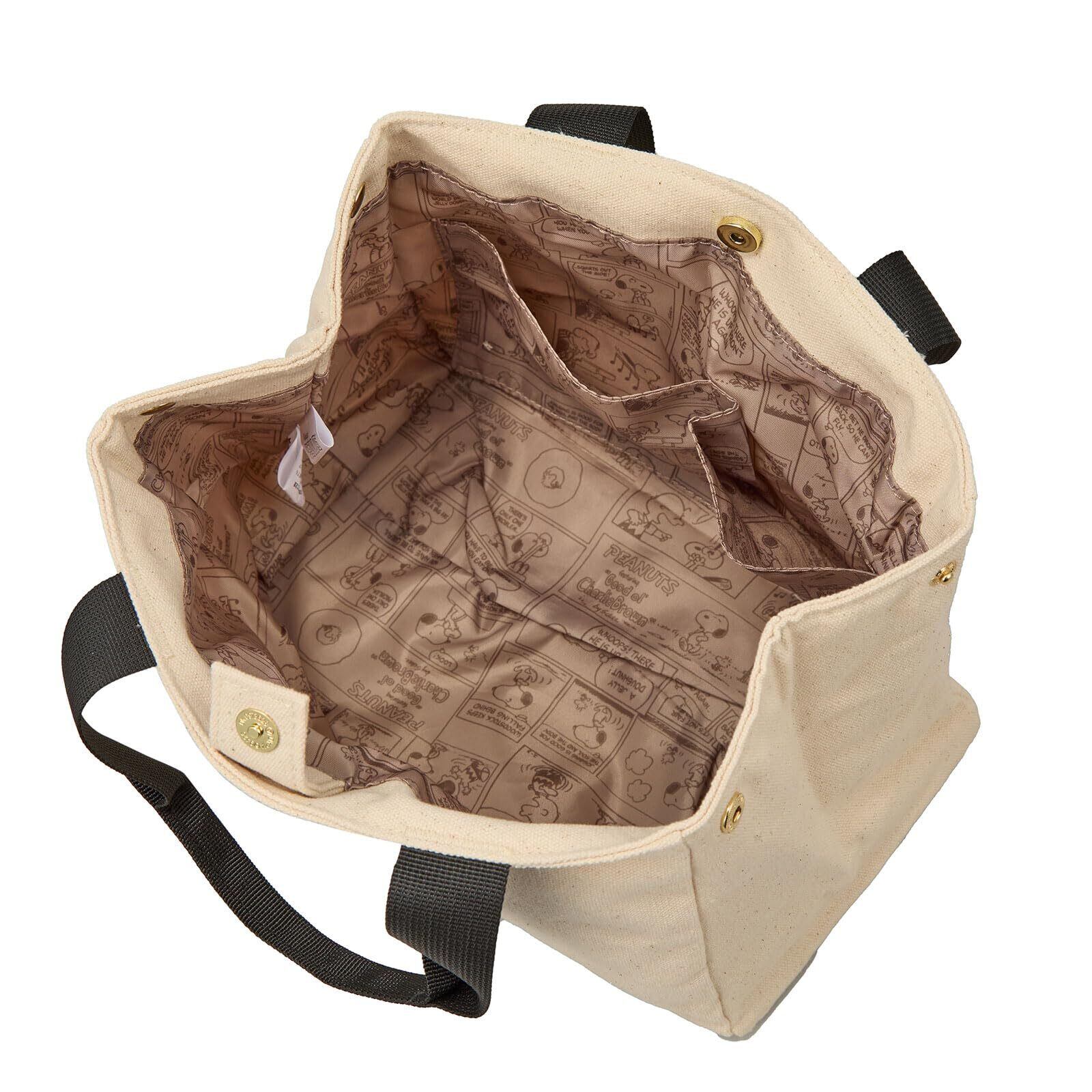 普段使いにおすすめなサイドボタンミニトートバッグ。バッグのサイドにボタンがついた帆布生地のカジュアルなバッグです。サイドボタンをつけたままでも外した状態でもお好みの形に変えてご使用いただけるおしゃれなバッグ。バッグ横についたスヌーピーのタグや内装がスヌーピーの総柄になっているのもかわいい! マチも広く、容量も約4Lと収納力も抜群。